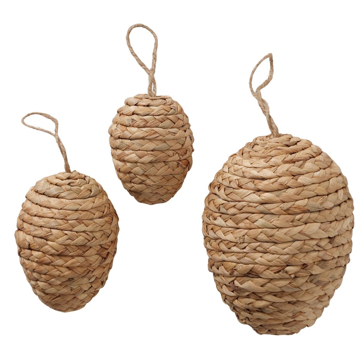 Mit diesem handgearbeiteten 3er Set bringst du natürliche Osterstimmung in dein Zuhause. Die Dekohänger in Eiform überzeugen mit ihrer warmen Naturfarbe, der geflochtenen Optik und einem ruhigen, harmonischen Look. Ob am Osterstrauch, am Fenster, an Zweigen oder als Teil deiner Frühlingsdeko: Diese Ostereier zum Hängen setzen schöne saisonale Akzente und passen wunderbar zu natürlichen Dekoideen.