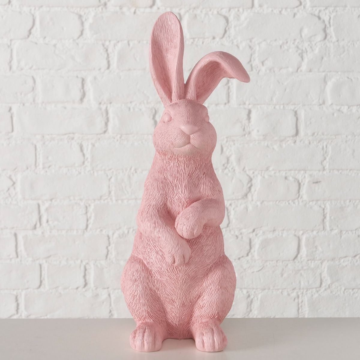 Der Dekoaufsteller ist handbemalt und dadurch mit besonderem Charakter versehen. Kleine feine Details in der Oberfläche und die sorgfältige Bemalung verleihen der Figur eine hochwertige Wirkung. Das Design ist exklusiv bei Boltze erhältlich und hebt sich durch die Kombination aus Größe, Farbe und markanter Hasenform von klassischer Osterdeko ab.