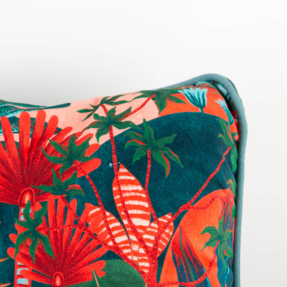 Luxuriöses Samtkissen: Exotisches Palmenmotiv auf der Vorderseite und elegante Uni-Veloursrückseite in Türkisgrün für vielseitige Dekoration. Mit hochwertiger Kederumrandung