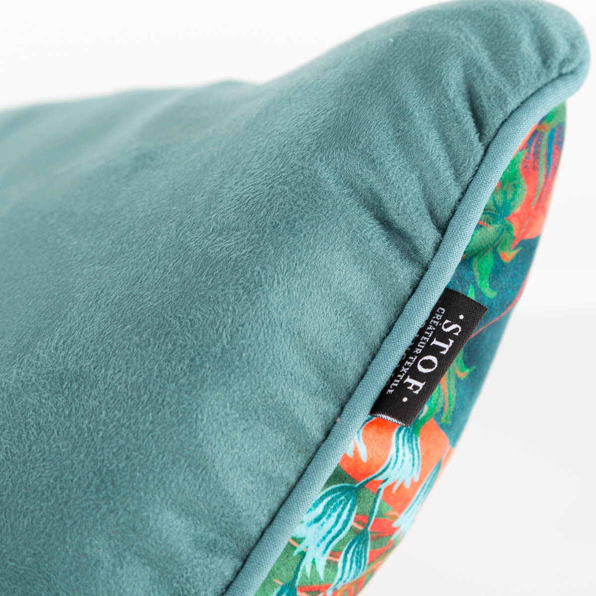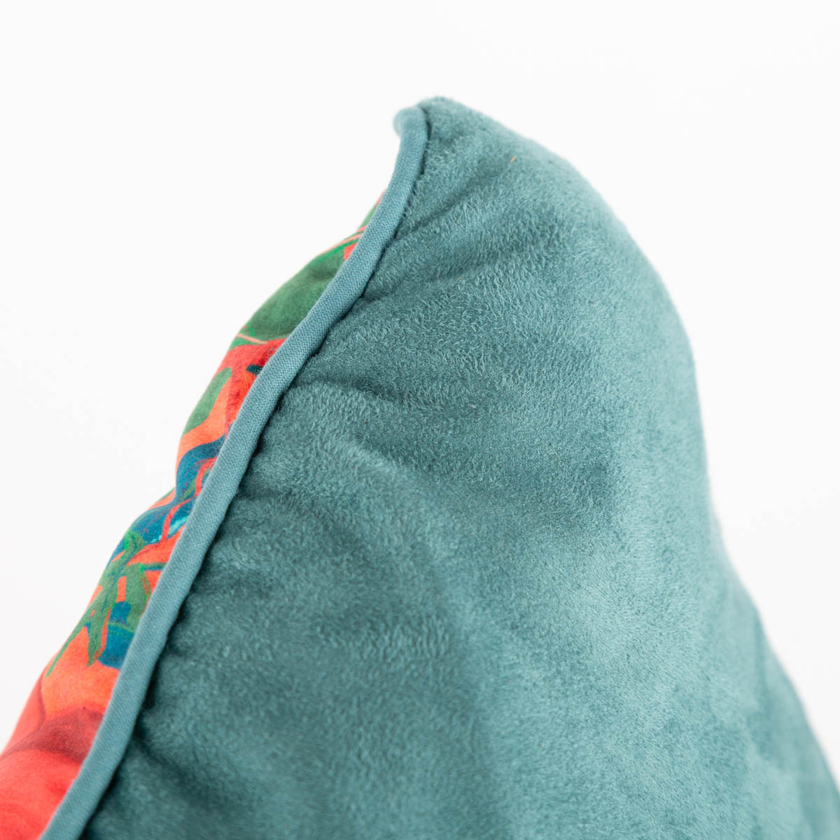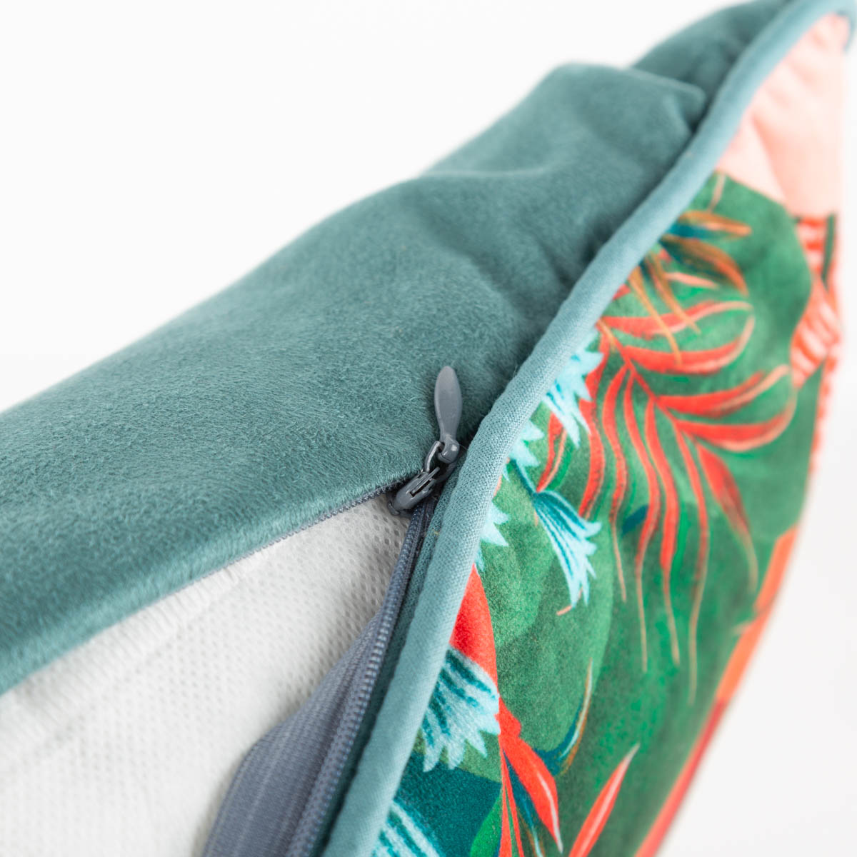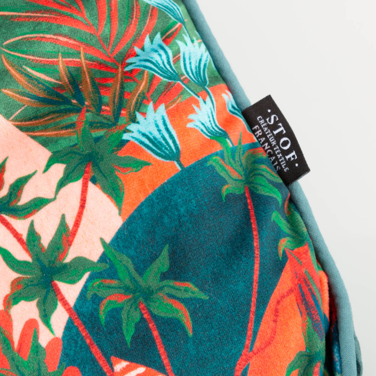 - Beidseitig verwendbar – wähle zwischen exotischem Palmenmotiv oder edler Uni-Veloursseite in Türkisgrün