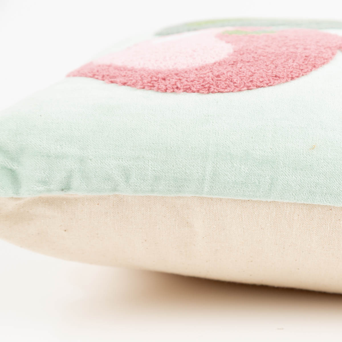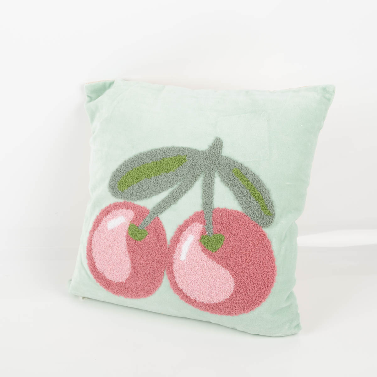 Vorderseite: Mintfarbener Baumwollvelours mit aufwendig getuftetem Kirschmotiv