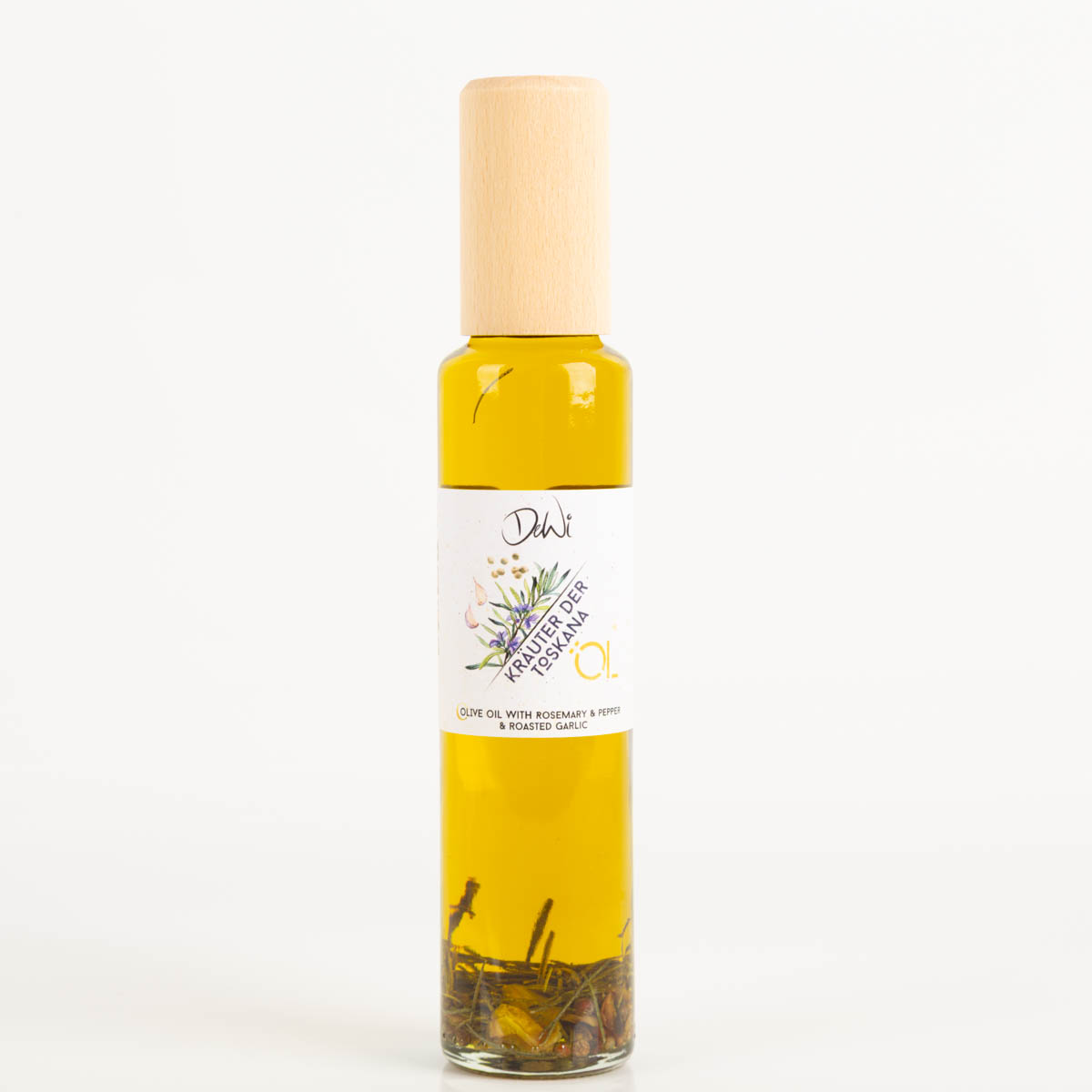 - Mit Rosmarin, Pfeffer und Knoblauch aromatisiertes Olivenöl aus Italien mit Einlage
