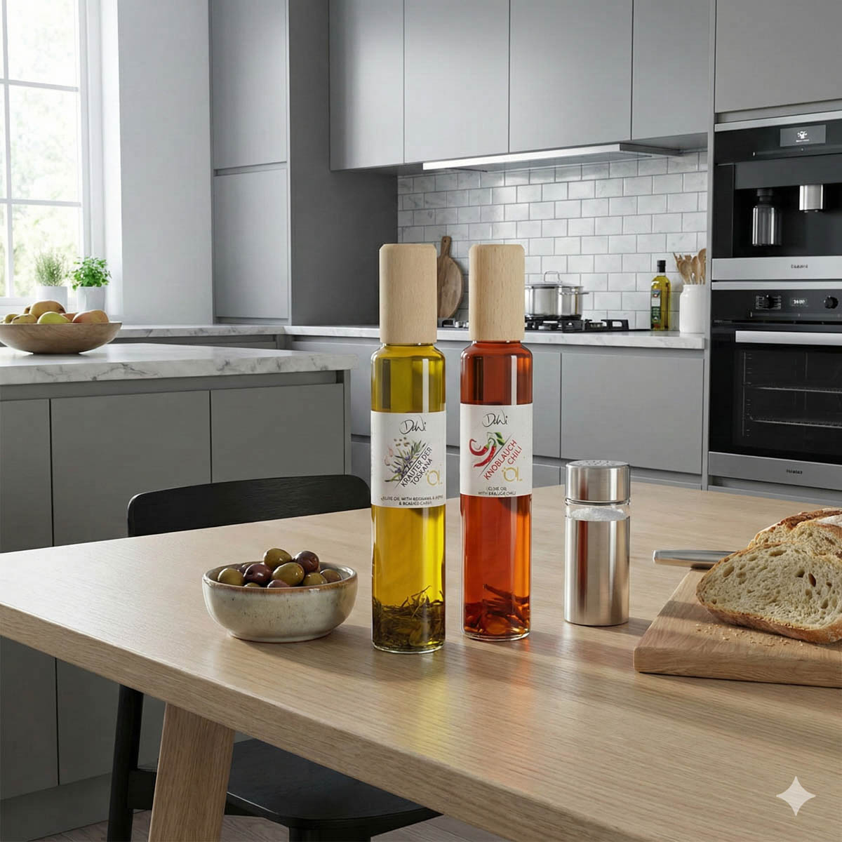 - Mit Rosmarin, Pfeffer und Knoblauch aromatisiertes Olivenöl aus Italien