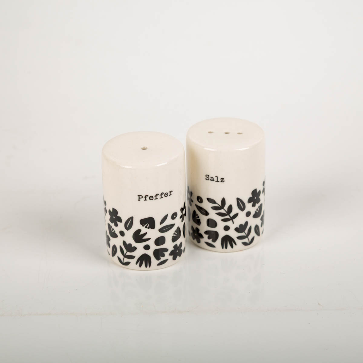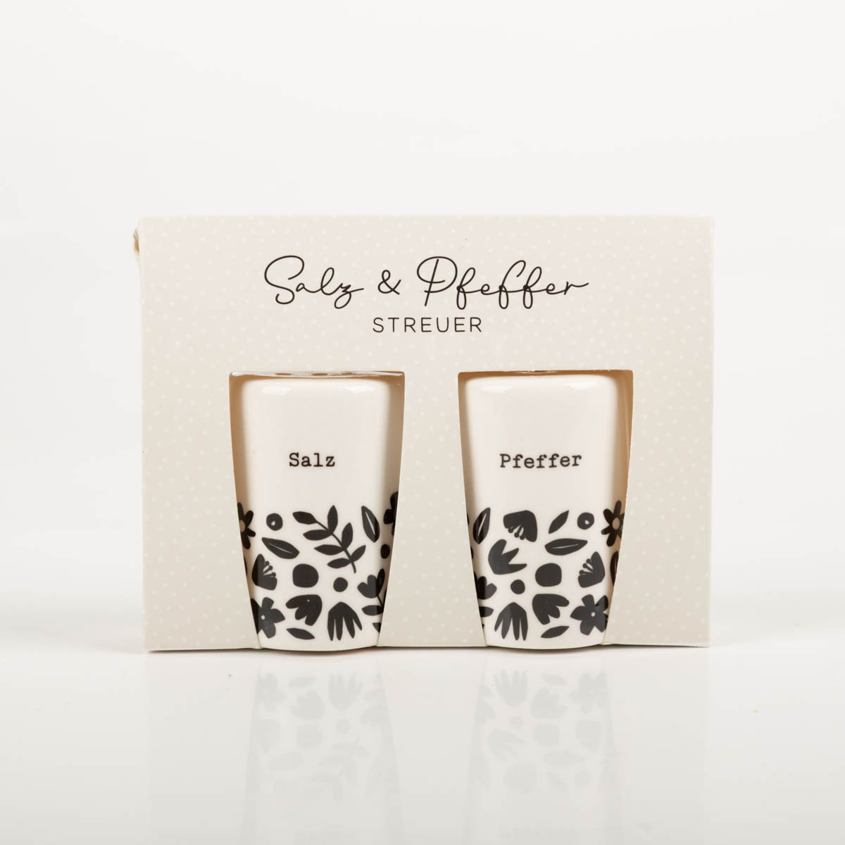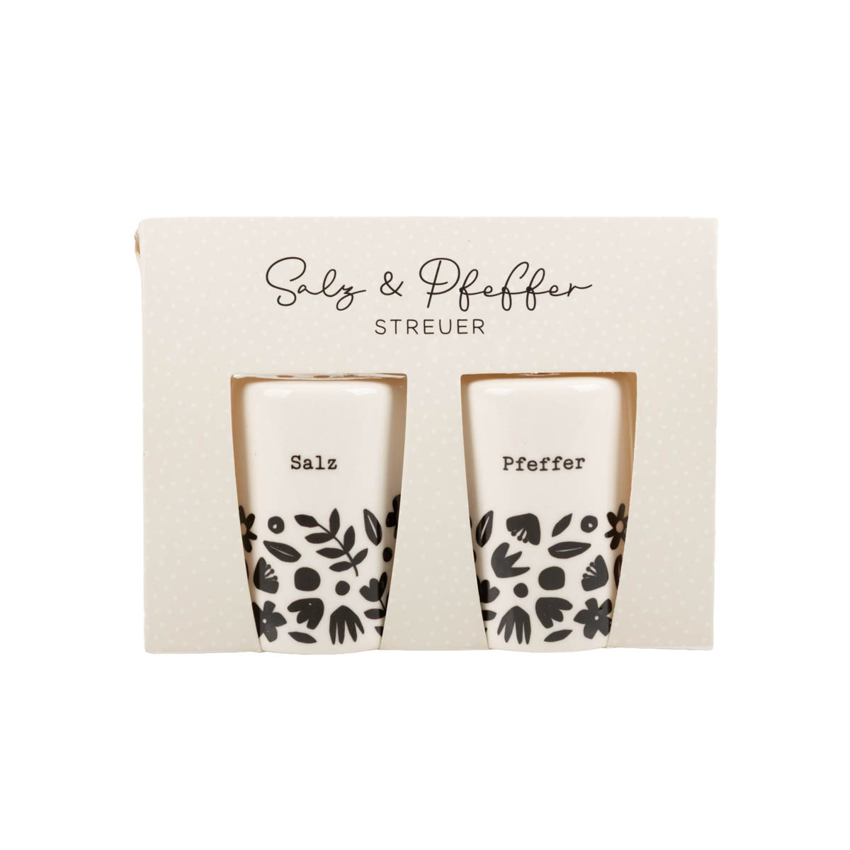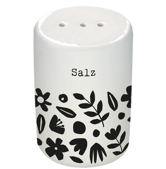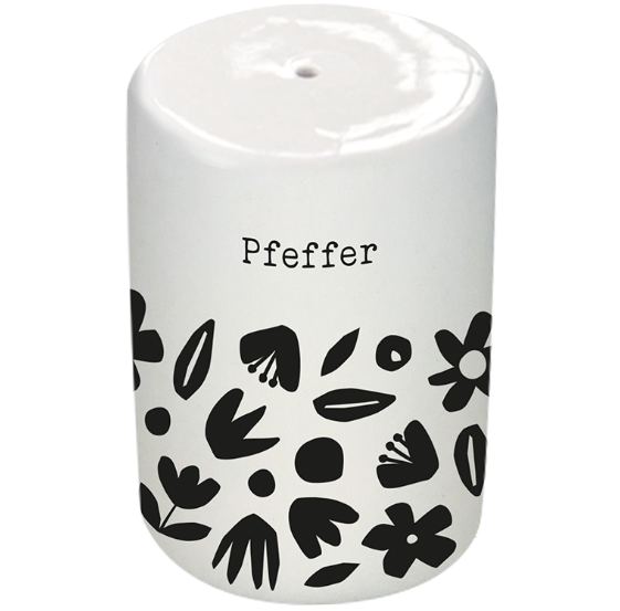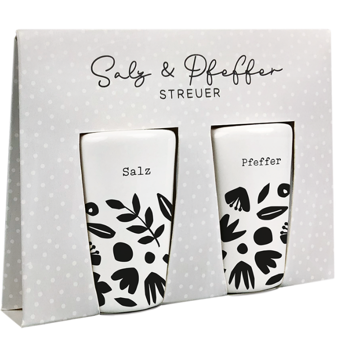 Dieses 2-teilige Salz- und Pfefferstreuer-Set bringt Charme auf deinen Tisch: weißes Keramikdesign mit grafischen Blumen in Schwarz und klarer Beschriftung „Salz“ und „Pfeffer“. Ob Frühstück, Dinner oder Brunch – du würzt schnell, sauber und mit einem Look, der zu vielen Tischdekos passt.