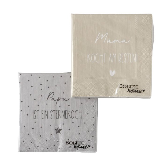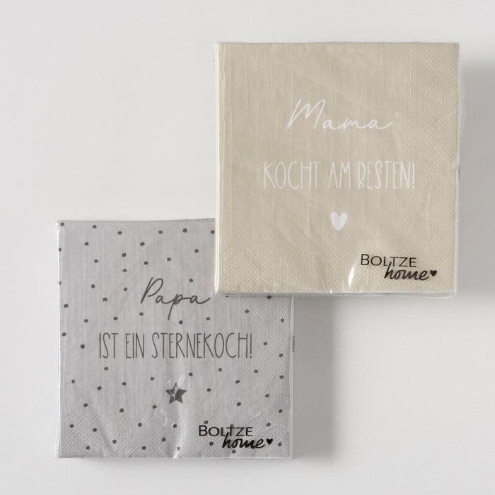 Diese Servietten bringen Komplimente an den Tisch: Wähle zwischen „Papa ist ein Sternekoch!“ oder „Mama kocht am besten!“. 3-lagig, weich, aus FSC-zertifiziertem Papier – perfekt für Familienessen, Brunch oder kleine Partys.