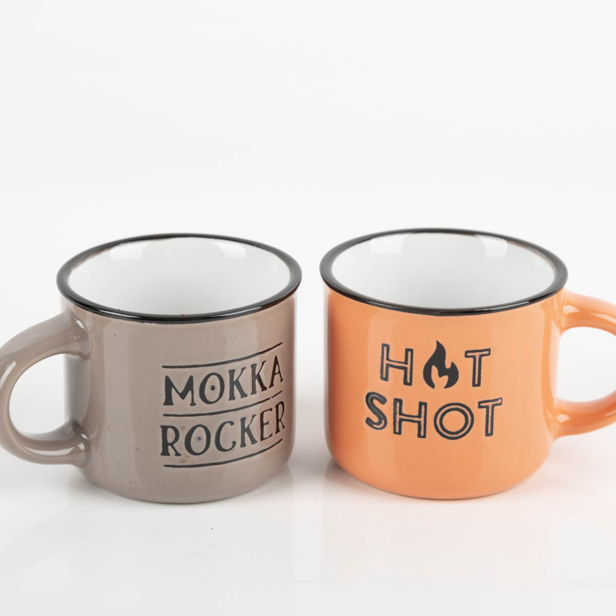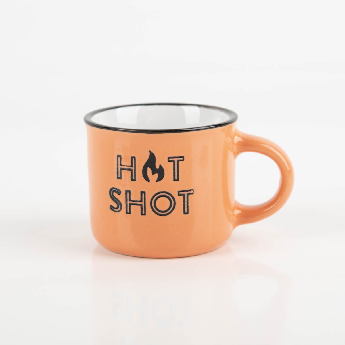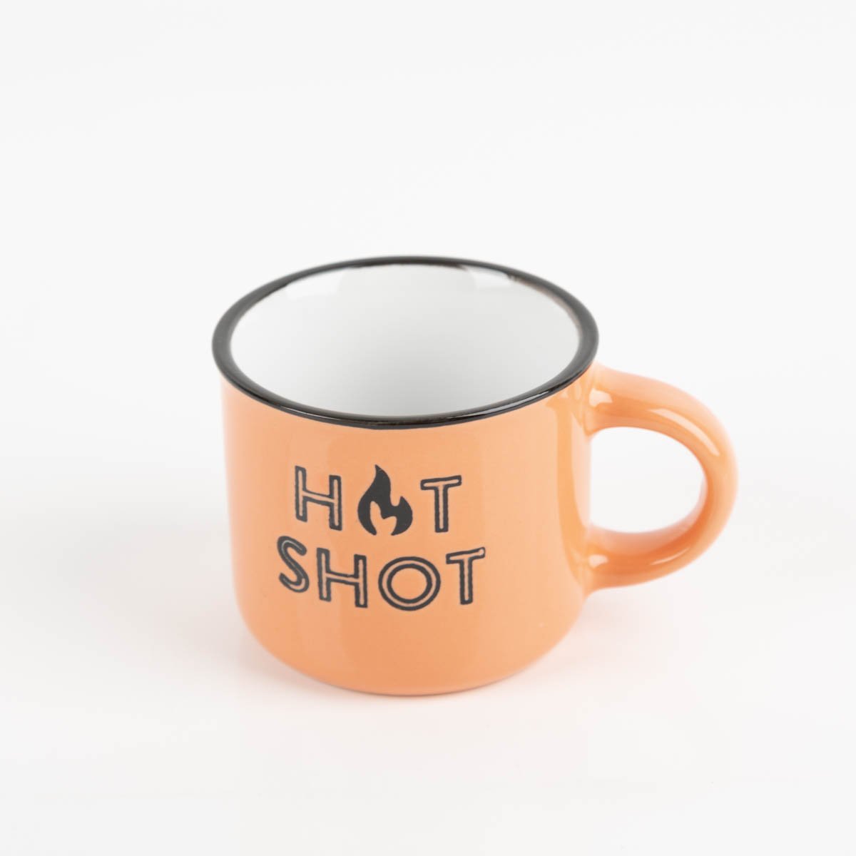 Die Espresso Tasse HOT SHOT von Grafik Werkstatt bringt Retro-Charme auf deinen Tisch! Mit ihrem nostalgischen Emaille-Look in strahlendem Orange und dem tiefgeprägten Schriftzug „HOT SHOT“ ist sie ein echter Hingucker für Espresso-Liebhaber.