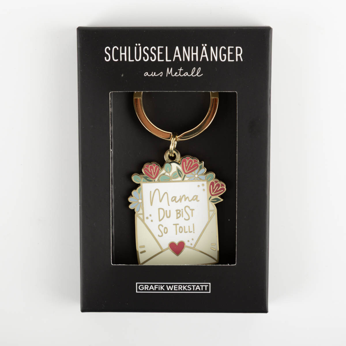 Mit diesem liebevoll gestalteten Schlüsselanhänger Mama Du bist so toll! von Grafik Werkstatt zeigst du deiner Mutter, wie wichtig sie dir ist. Das detailreiche Design mit Umschlag, Blumen und Herz macht den Anhänger zu einem besonderen Symbol der Wertschätzung.