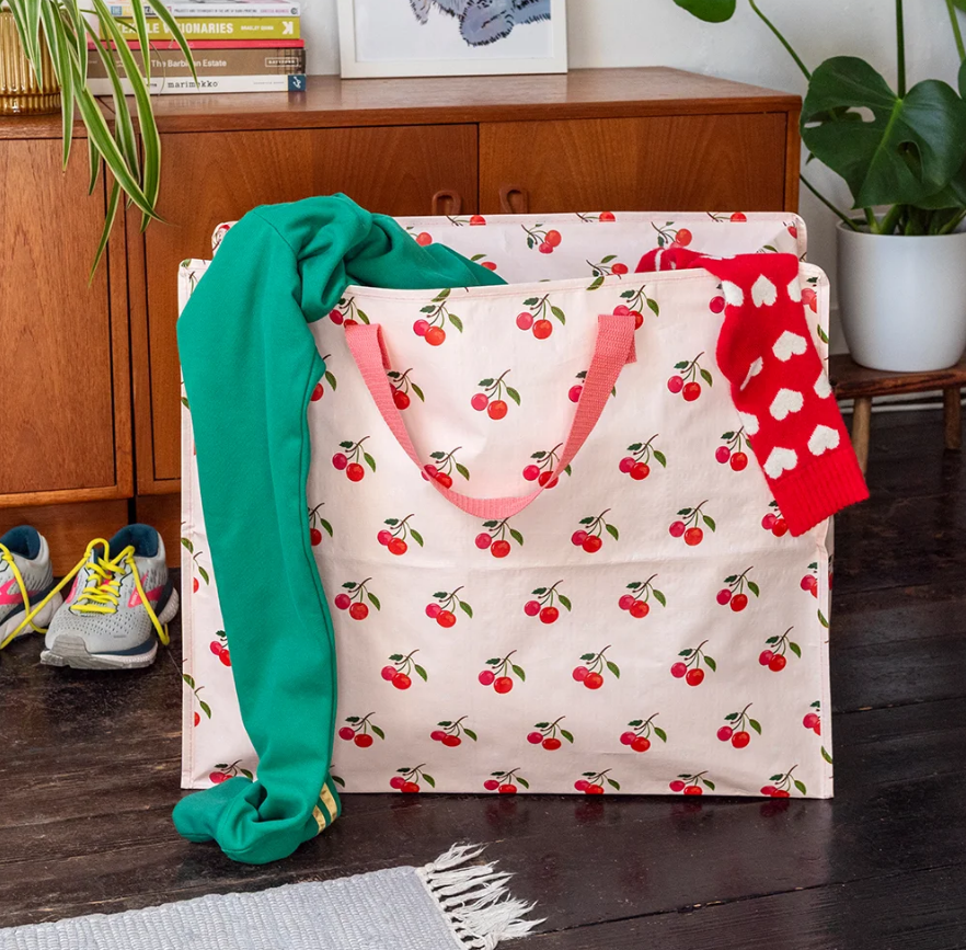 Große XXL-Aufbewahrungstasche von Rex London mit fröhlichem Kirschmuster auf rosa Hintergrund und einem Fassungsvermögen von ca. 78 Litern