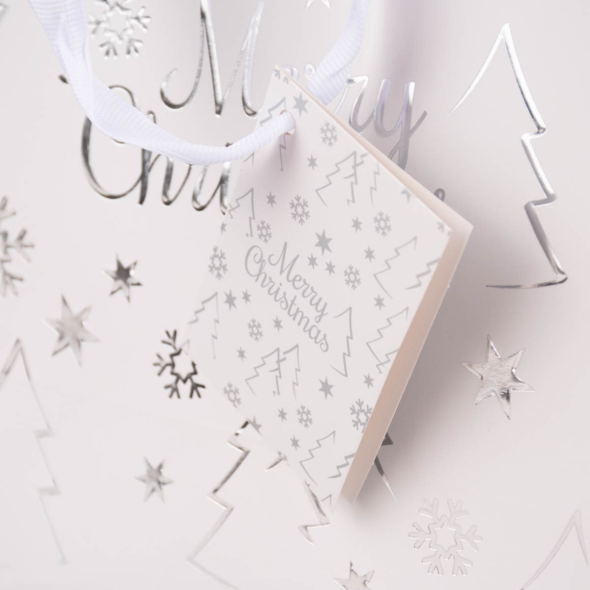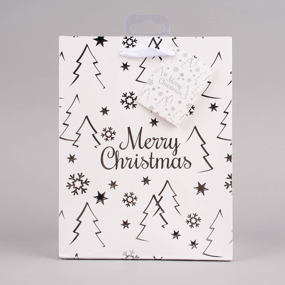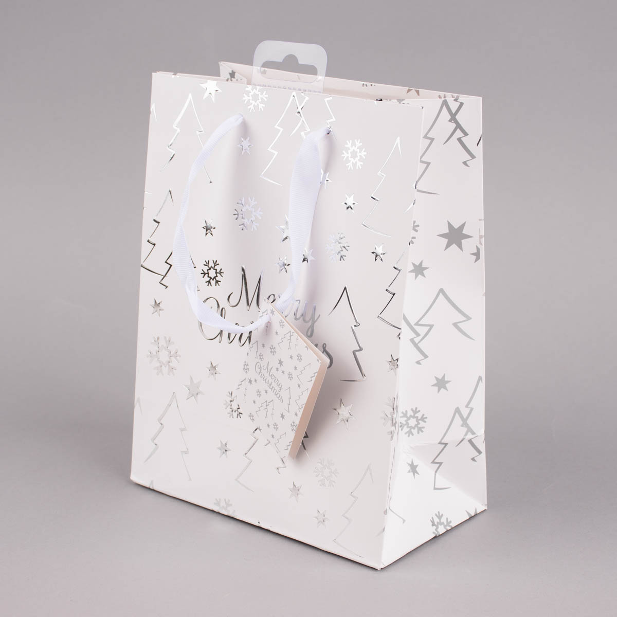 Geschenktasche mit Foliendruck Merry Christmas Tannenbaum weiß 18x23x10cm verschiedene Farben