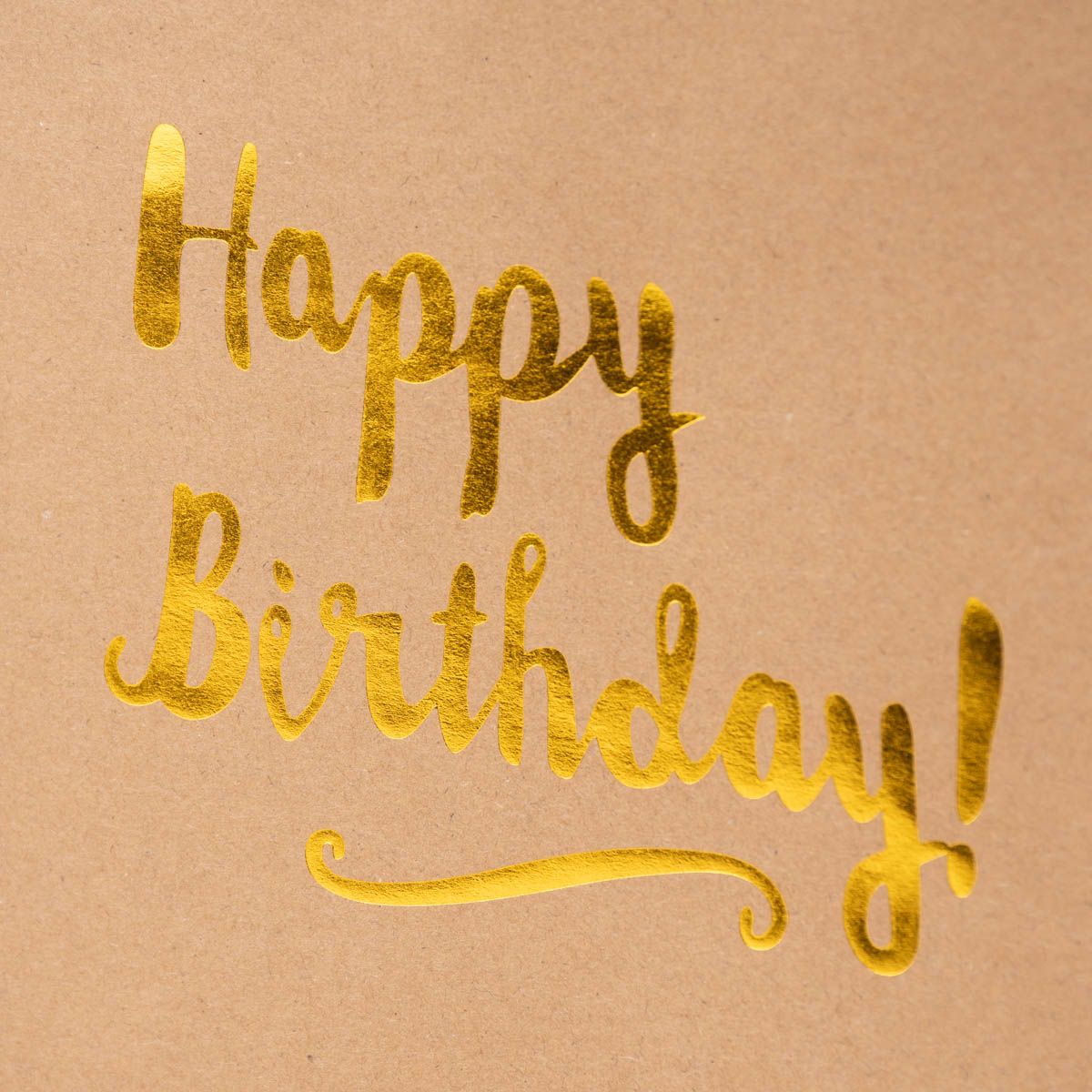 Aus Kraftpapier gefertigt hat die Geschenk-Tüte einen lässig-natürlichen Look und der goldfarbene Happy Birthday-Aufdruck wertet die Tüte noch etwas auf. Zusätzlich kannst du das Geschenk in etwas Seidenpapier packen und die Ecken oben herausstehen lassen, so ist das Auspackerlebnis auch sichergestellt.