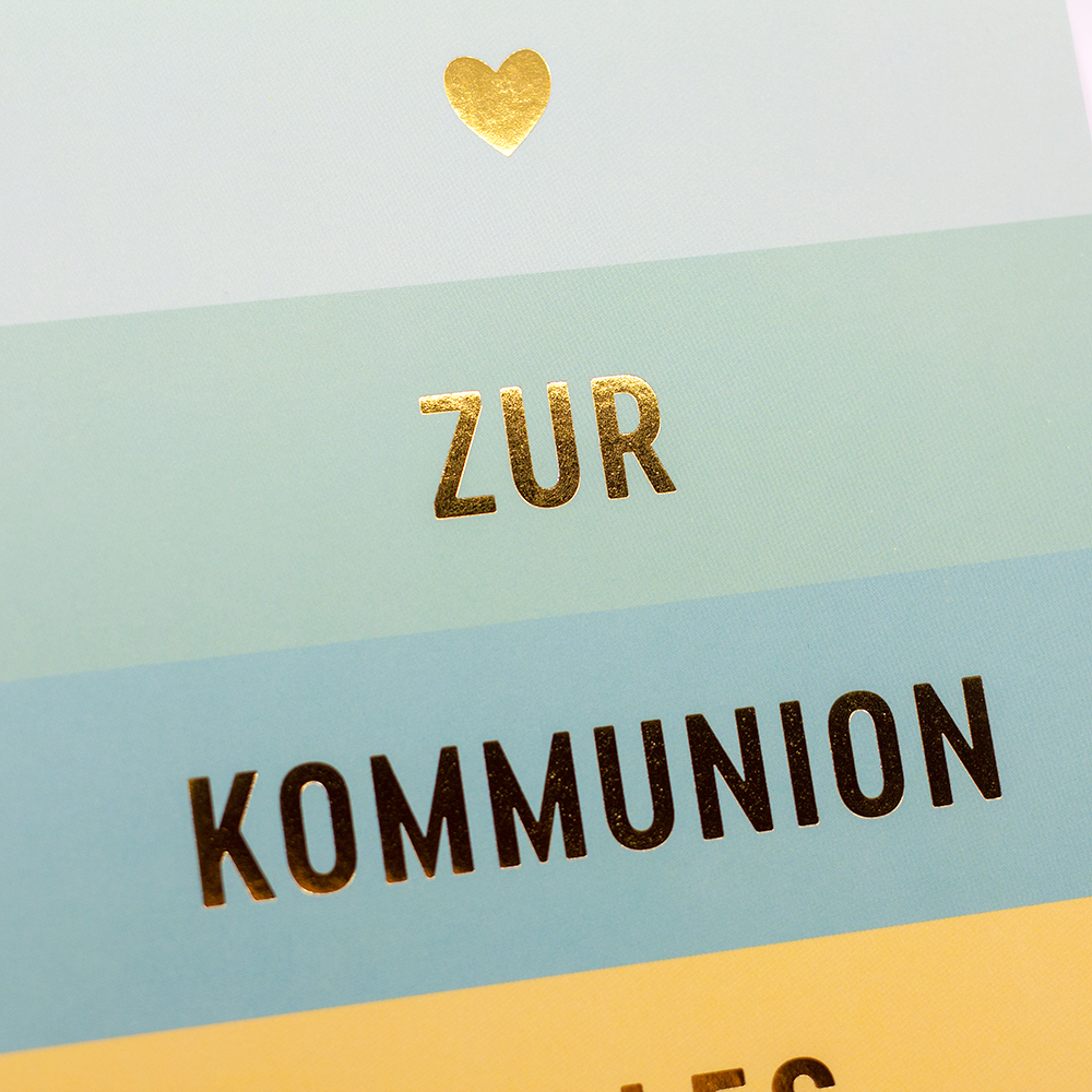 Die goldfarben veredelten Schriftzüge und das kleine Herz setzen glänzende Highlights und machen die Karte zu etwas ganz Besonderem. Gerade zur Kommunion ist eine geschmackvoll gestaltete Karte eine schöne Ergänzung zu einem Geschenk oder Geldgeschenk.