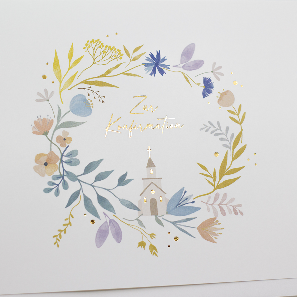 Hochwertige Doppelkarte zur Konfirmation mit stilvollem Blumenkranz und Kirchenmotiv