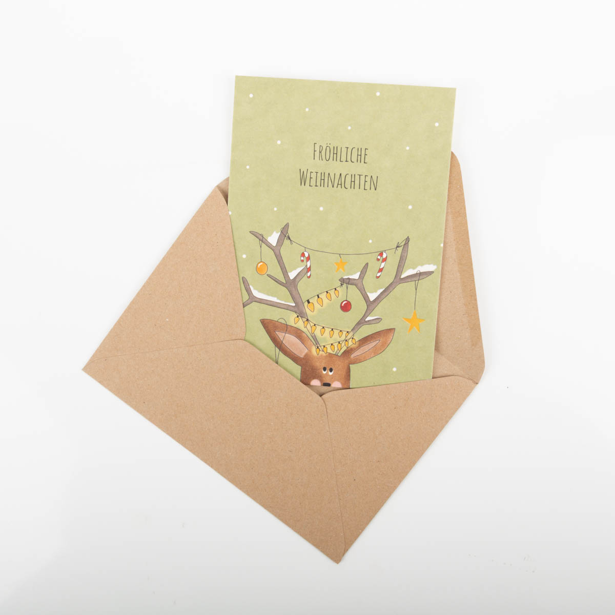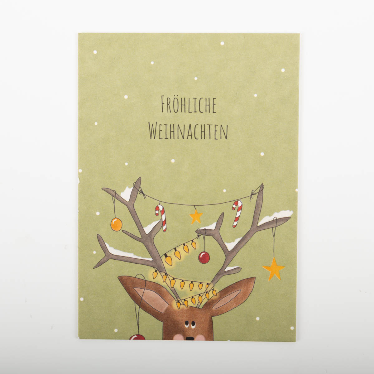 Hochwertige Postkarte mit originellem Hirsch mit weihnachtlich dekoriertem Geweih und Aufschrift "Fröhliche Weihnachten".