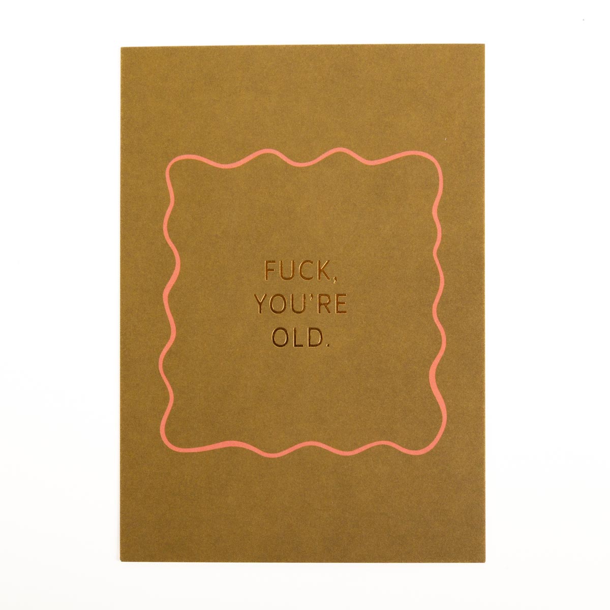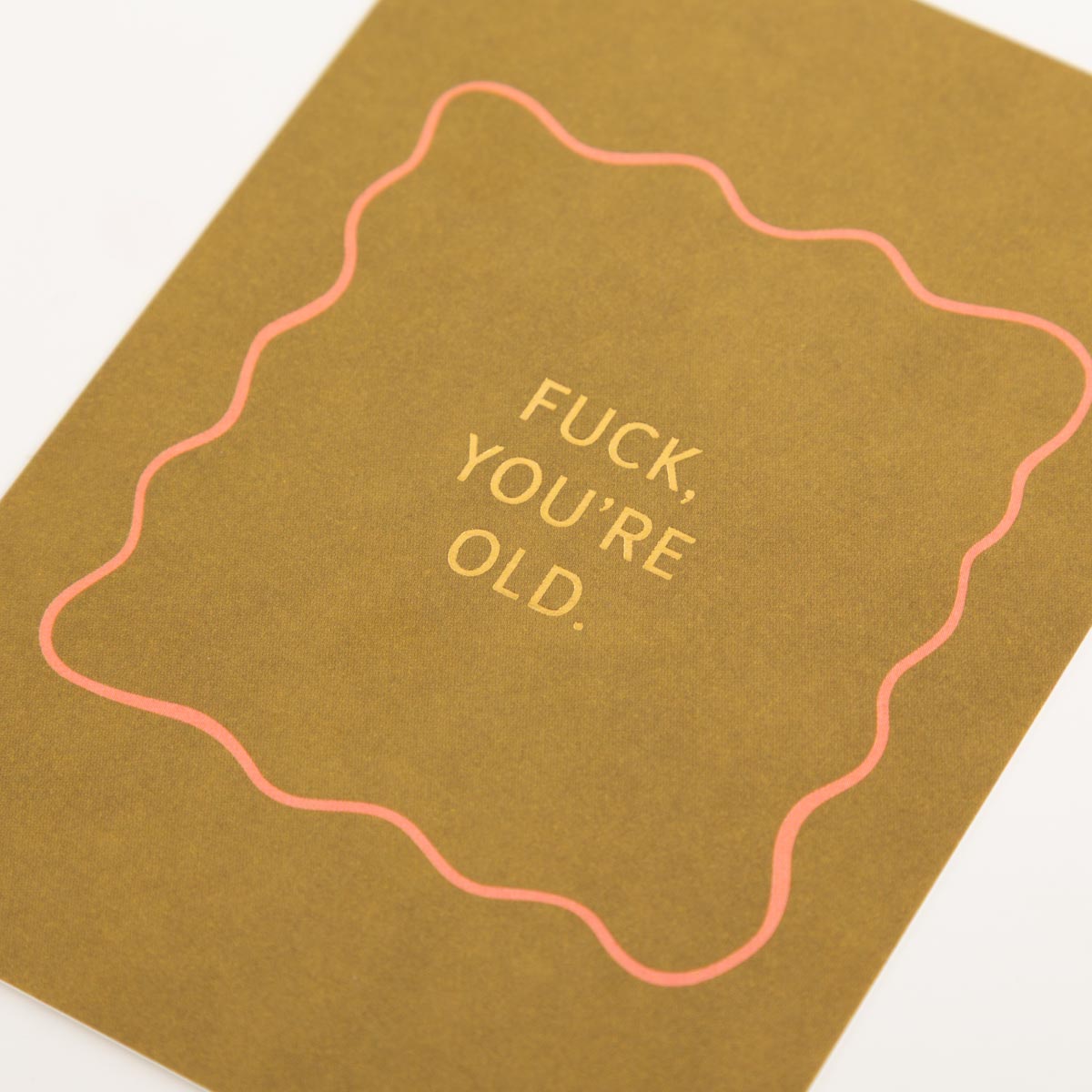Diese freche Postkarte bringt es humorvoll auf den Punkt. Der provokante Spruch „FUCK, YOU’RE OLD.“ trifft mit einem Augenzwinkern und sorgt garantiert für Lacher. Der senfgelbe Hintergrund in Kombination mit der hochwertigen Goldveredelung (Hotfoil) macht die Karte zu einem echten Hingucker – perfekt für Geburtstage mit Humor.