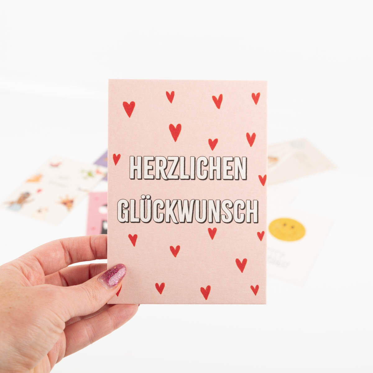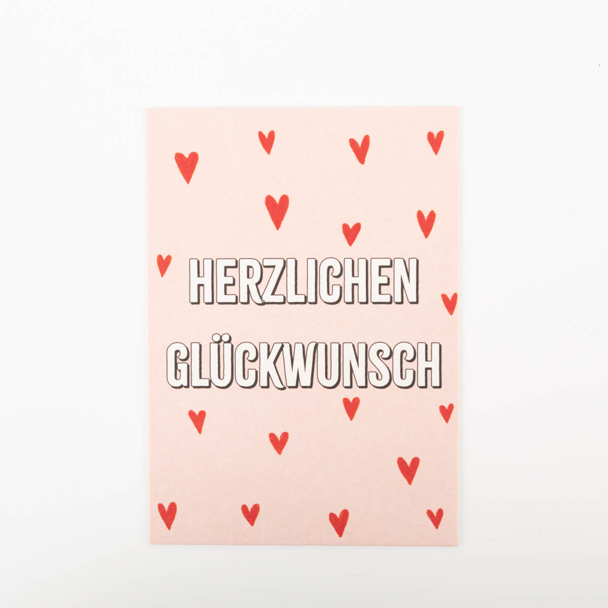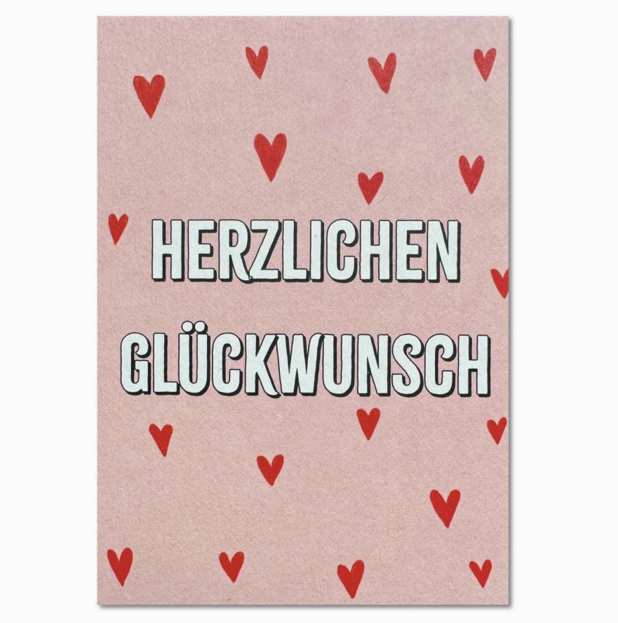 • Rosa Postkarte mit roten Herzen und Aufschrift „Herzlichen Glückwunsch“