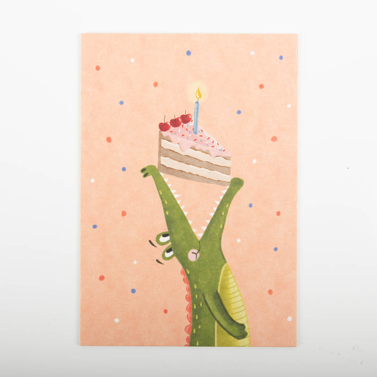 Versende Freude mit der Postkarte Krokodil von KEITCARDS. Das lustige Krokodil mit Kuchenstück im Maul macht die Karte zu einem echten Hingucker.