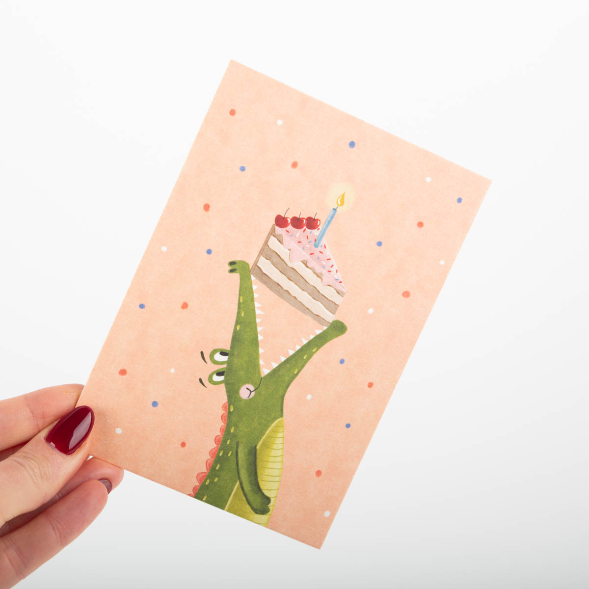 Postkarte Krokodil mit Kuchen aus Pappe A6 von KEITCARDS