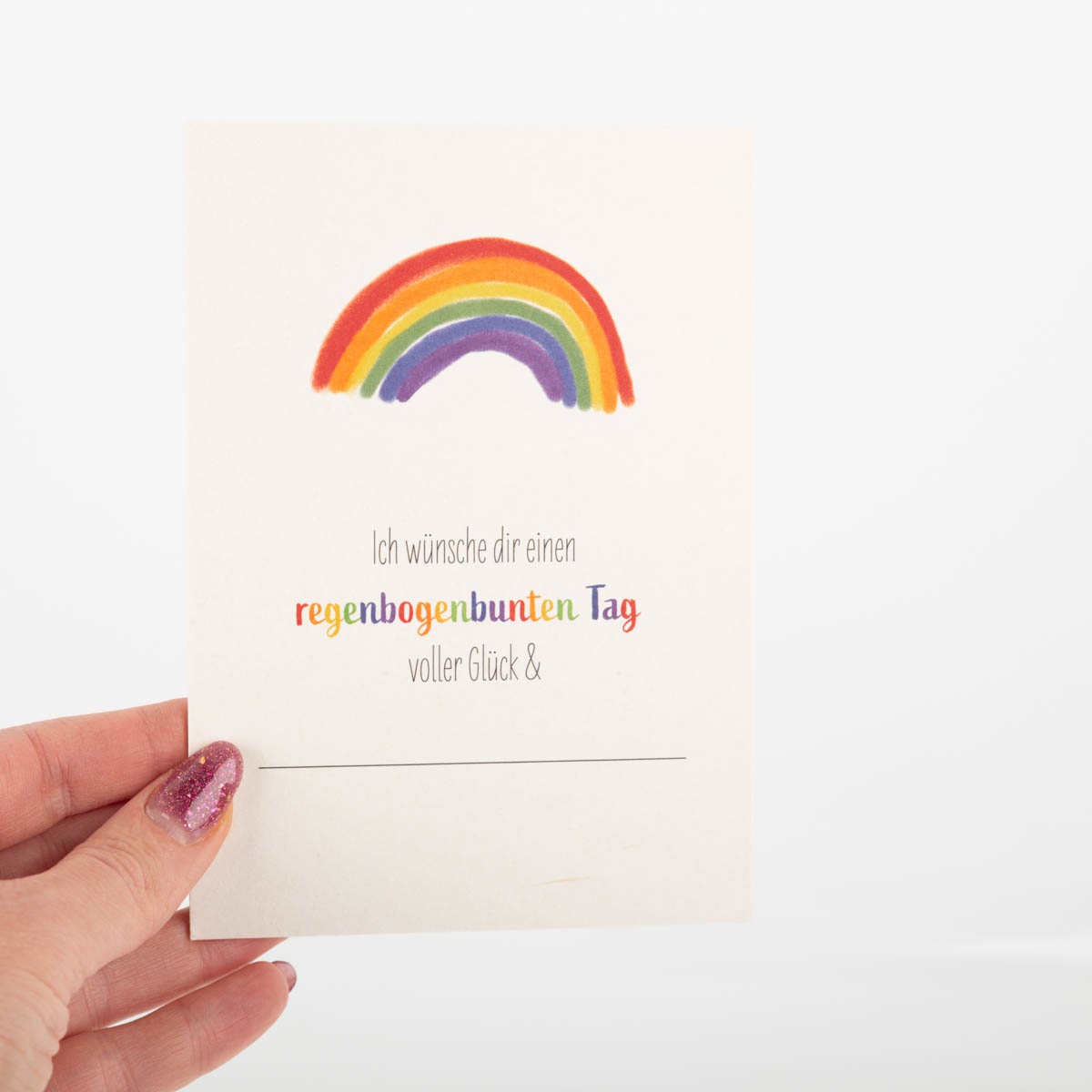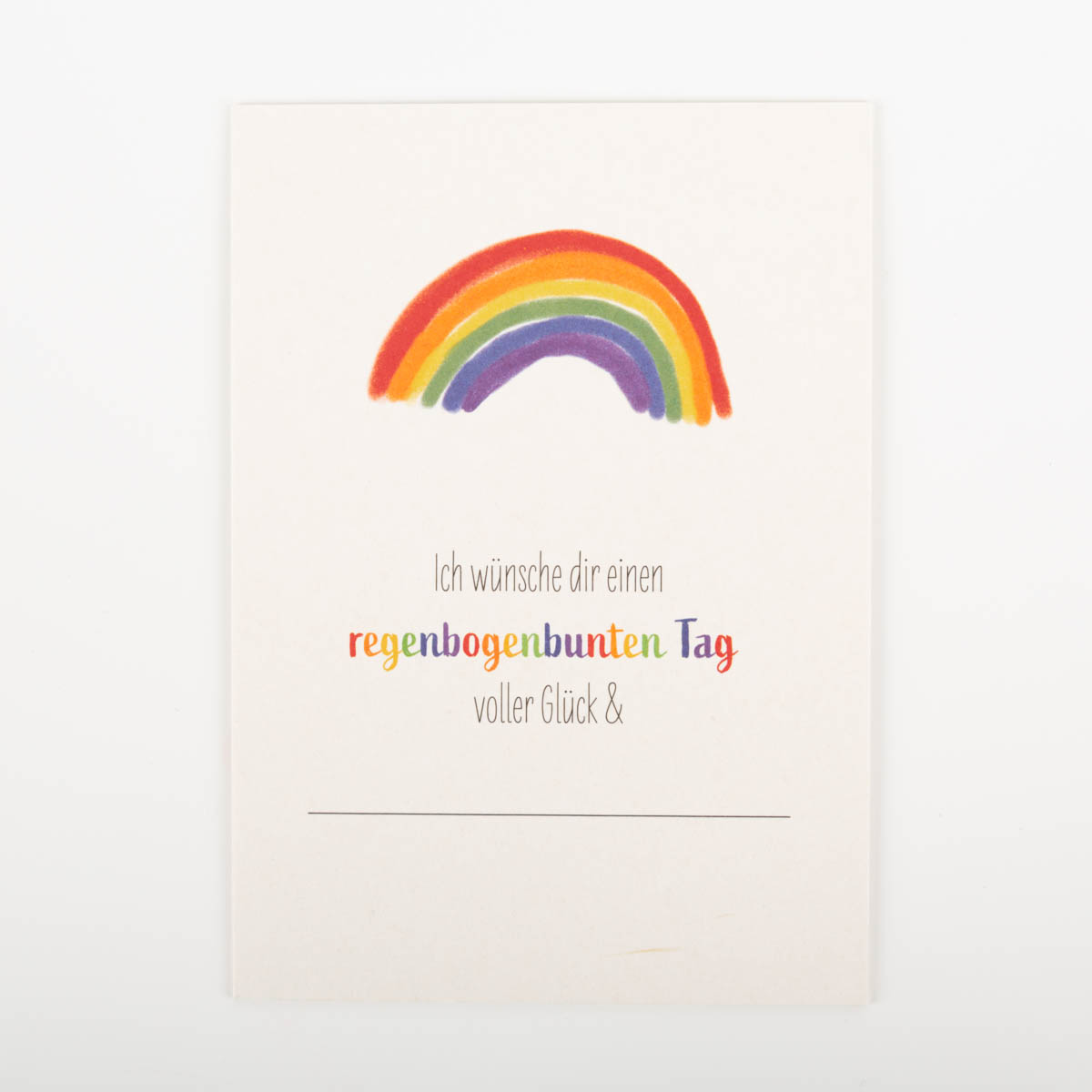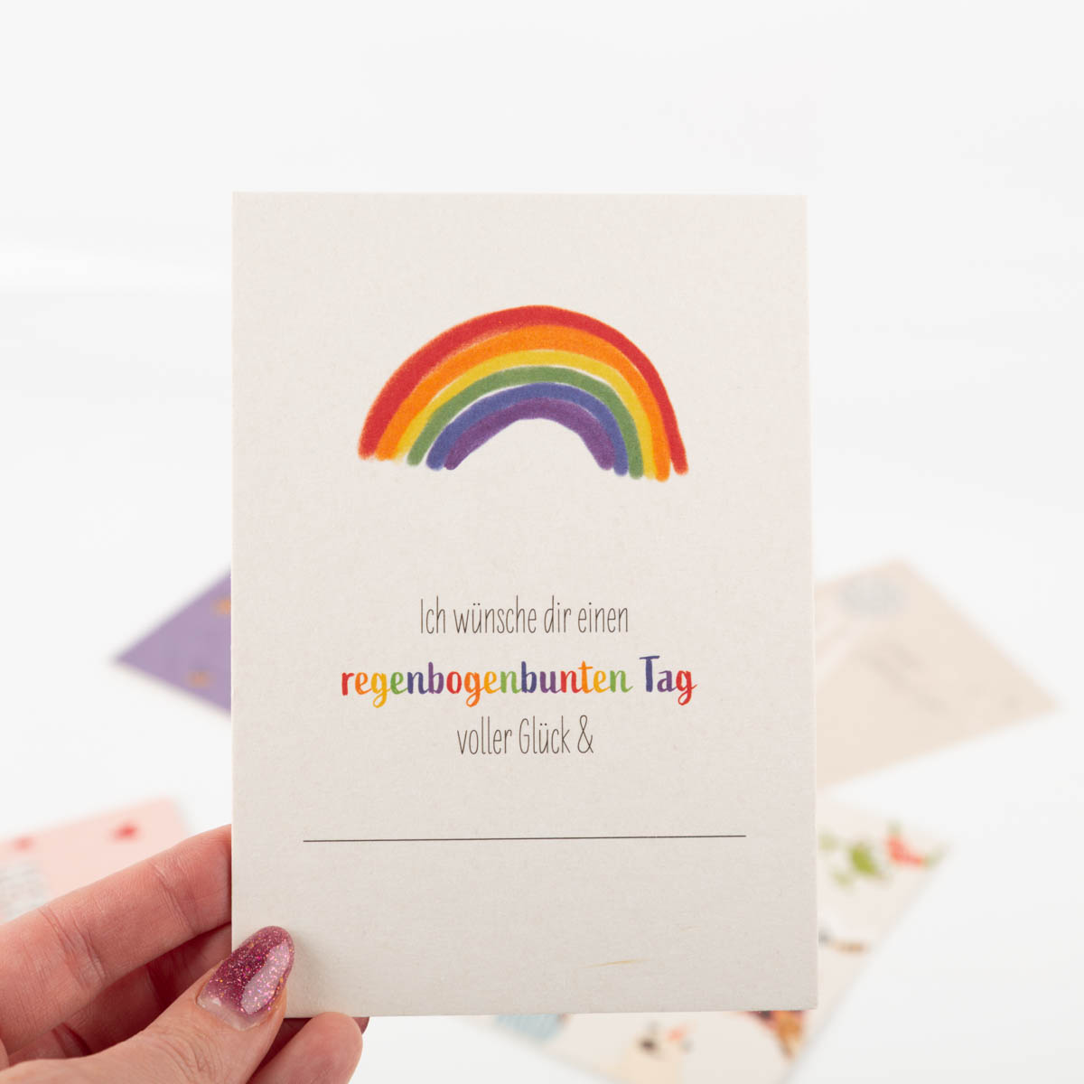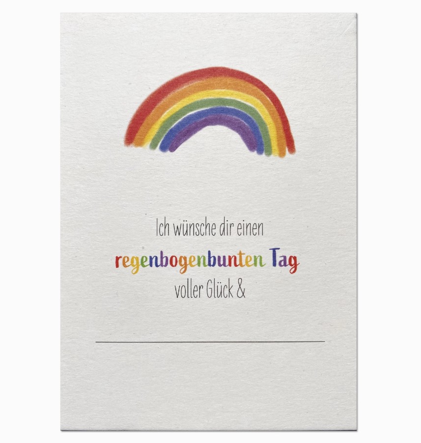 Die Postkarte Regenbogen von KEITCARDS bringt Farbe in den Alltag. Mit dem Spruch „Ich wünsche dir einen regenbogenbunten Tag voller Glück & …“ und dem bunten Regenbogenmotiv ist sie ideal, um Freude zu verschenken – sei es zum Geburtstag, als kleine Aufmunterung oder einfach zwischendurch.