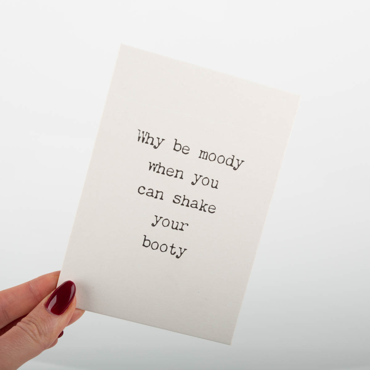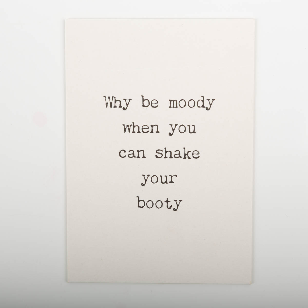 Versende eine originelle Botschaft mit der Postkarte von KEITCARDS. Die Aufschrift "Why be moody when you can shake your booty" macht die Karte zu einem echten Hingucker und lädt zum Schmunzeln und Nachdenken ein.