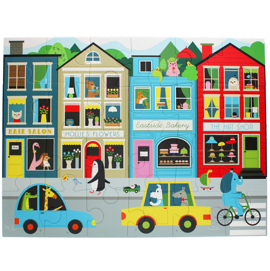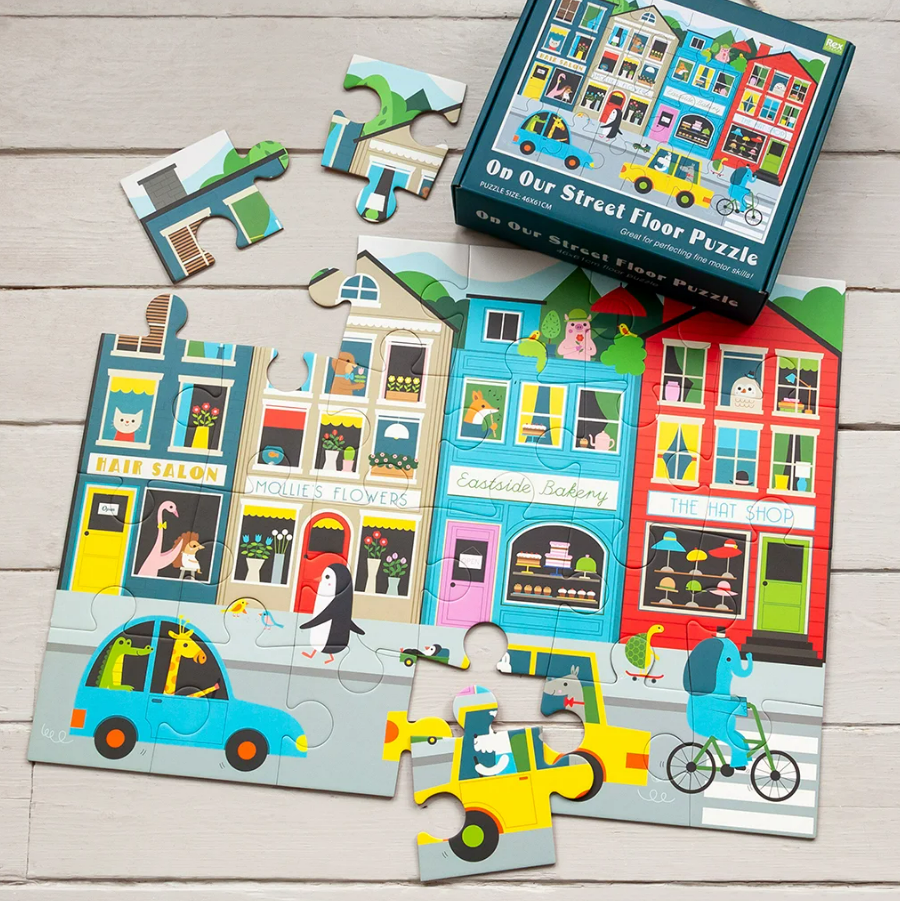 Großes Fußboden-Puzzle von Rex London mit 24 Teilen und farbenfroher Straßenszene voller tierischer Figuren und liebevoller Details