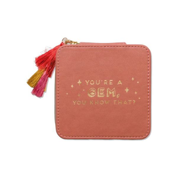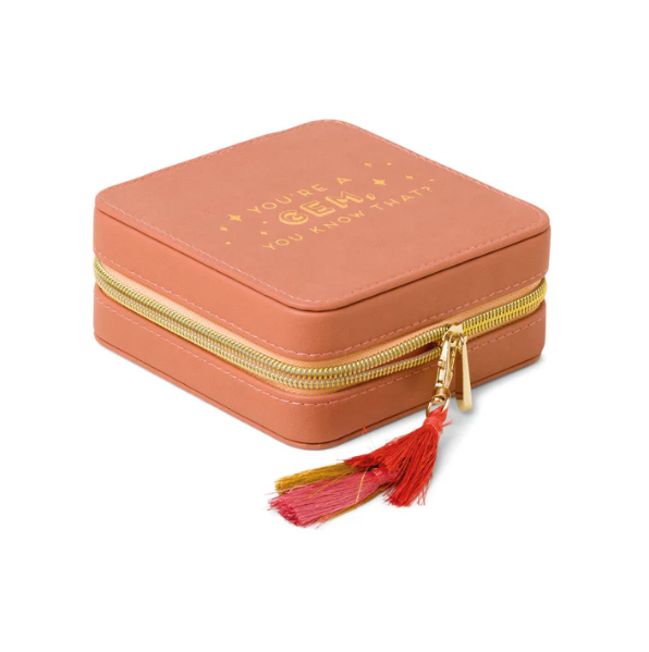 Das Schmuckkästchen You’re A Gem verbindet stilvolle Schmuckaufbewahrung mit einer positiven, wertschätzenden Botschaft. Die goldfarbene Folienprägung mit dem Schriftzug „You’re a gem, you know that?“ macht dieses Etui zu etwas ganz Besonderem. Die warme Terracotta-Farbe verleiht dem Design eine moderne, wohnliche Ausstrahlung.