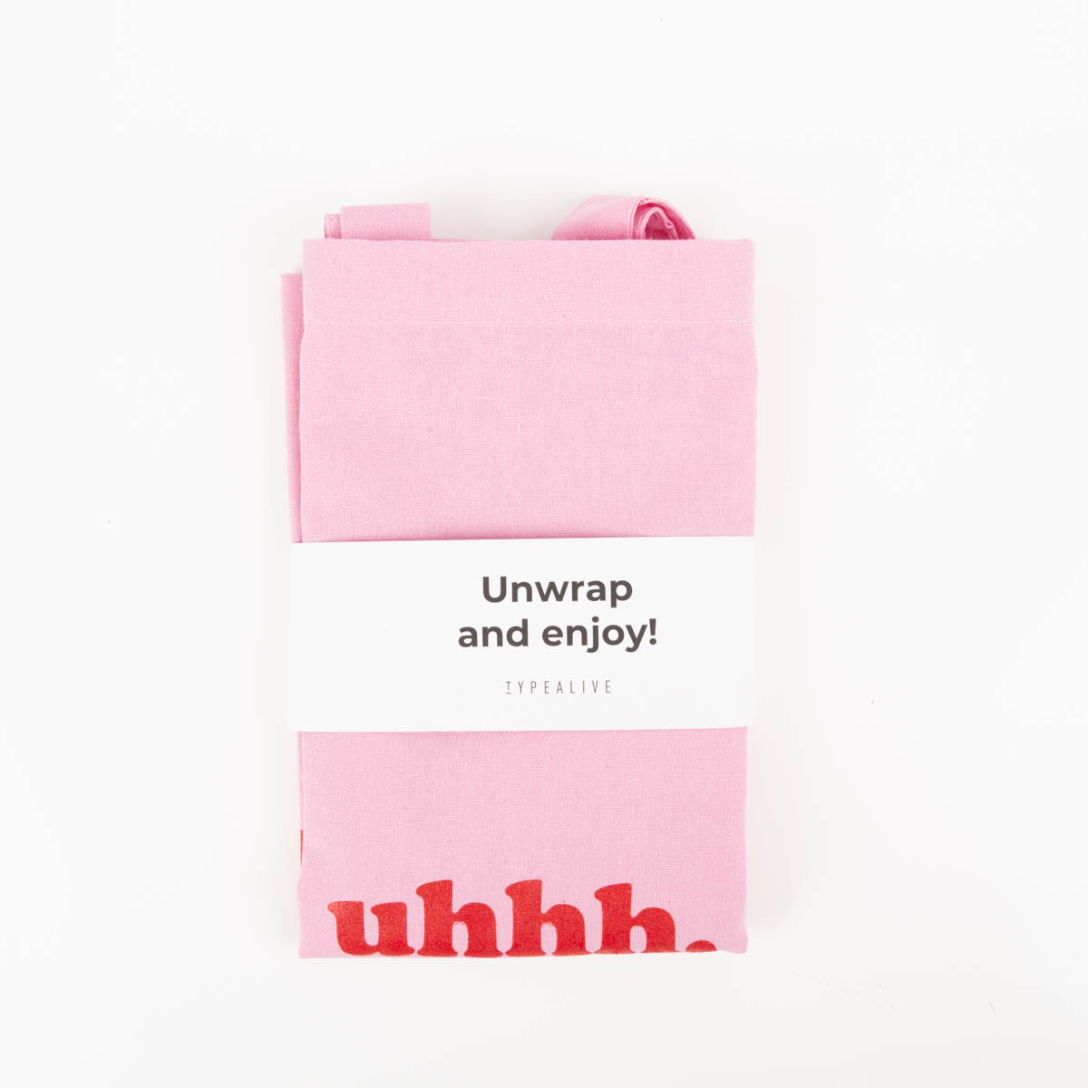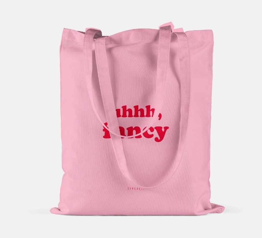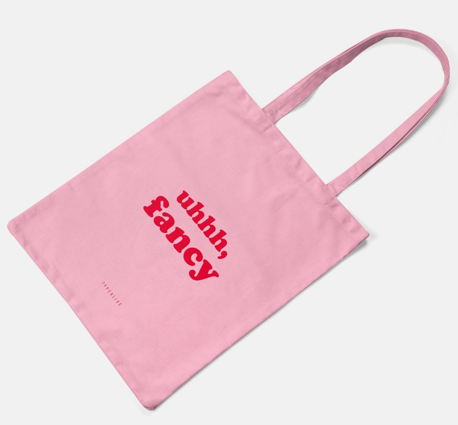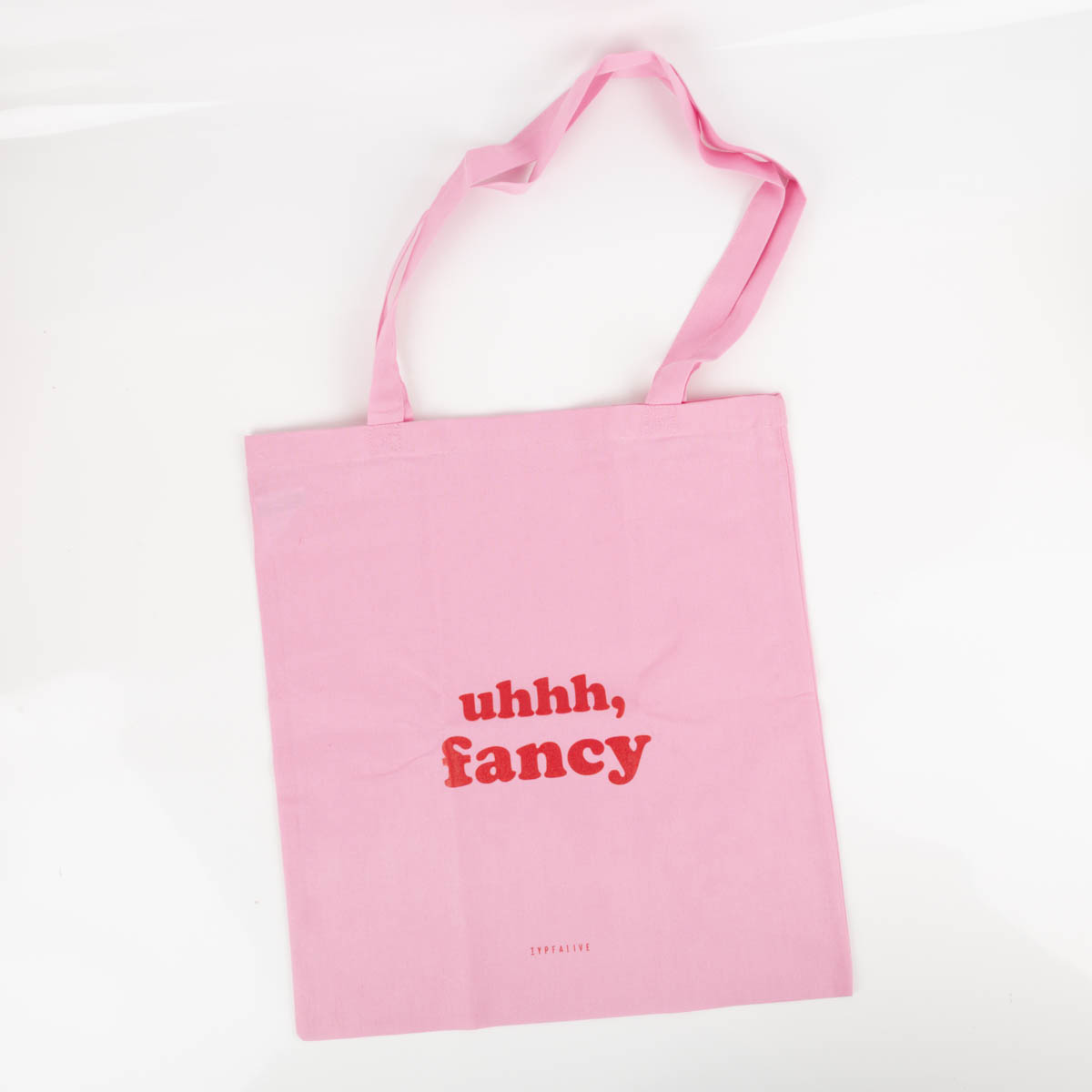 Rosa Baumwolltasche mit rotem Aufdruck „uhhh, fancy“ als Blickfang