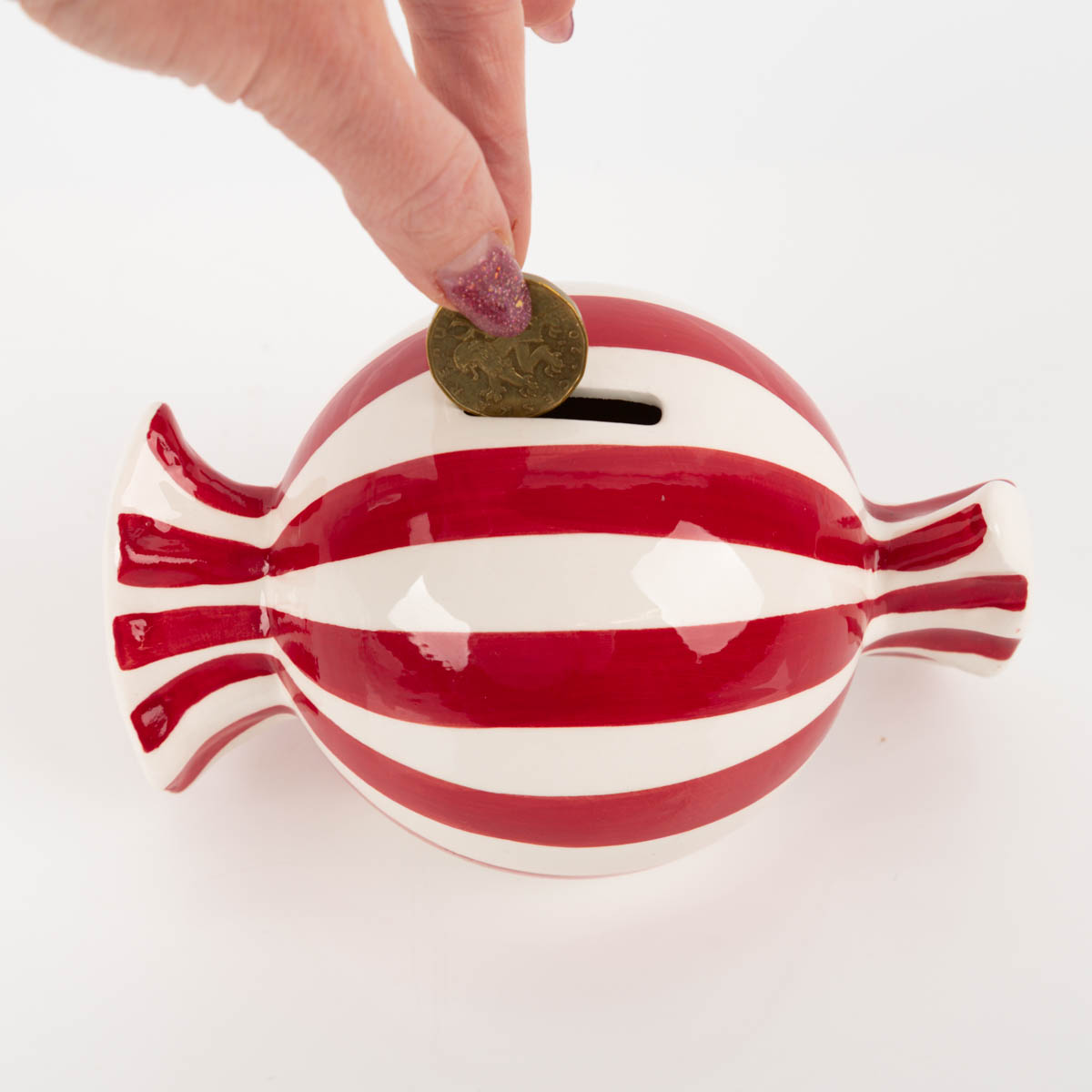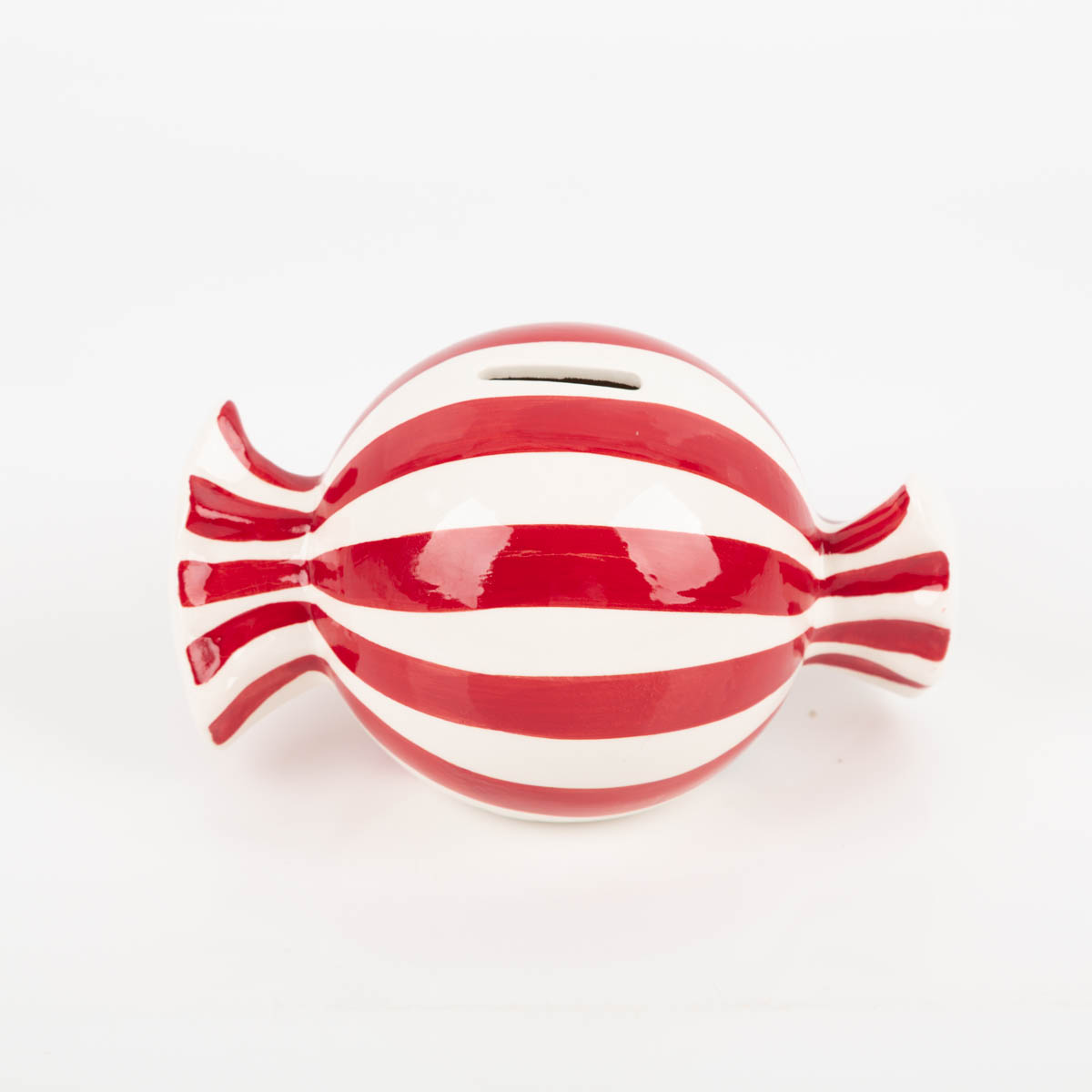 Handgearbeitete Keramik-Spardose in Bonbon-Form – rot-weiß gestreift.