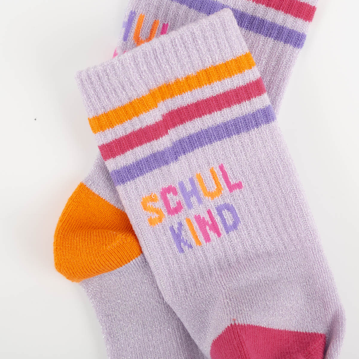 Die Kindersocken Schulkind von Grafik Werkstatt sind das perfekte Geschenk zum Schulstart! In fröhlichen Farben mit eingestricktem „Schulkind“-Schriftzug und funkelndem Glitzergarn sorgen sie für gute Laune bei jedem Schritt.
