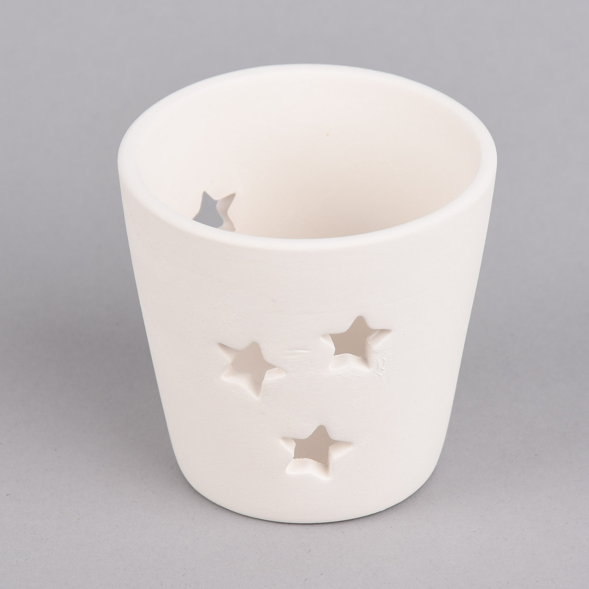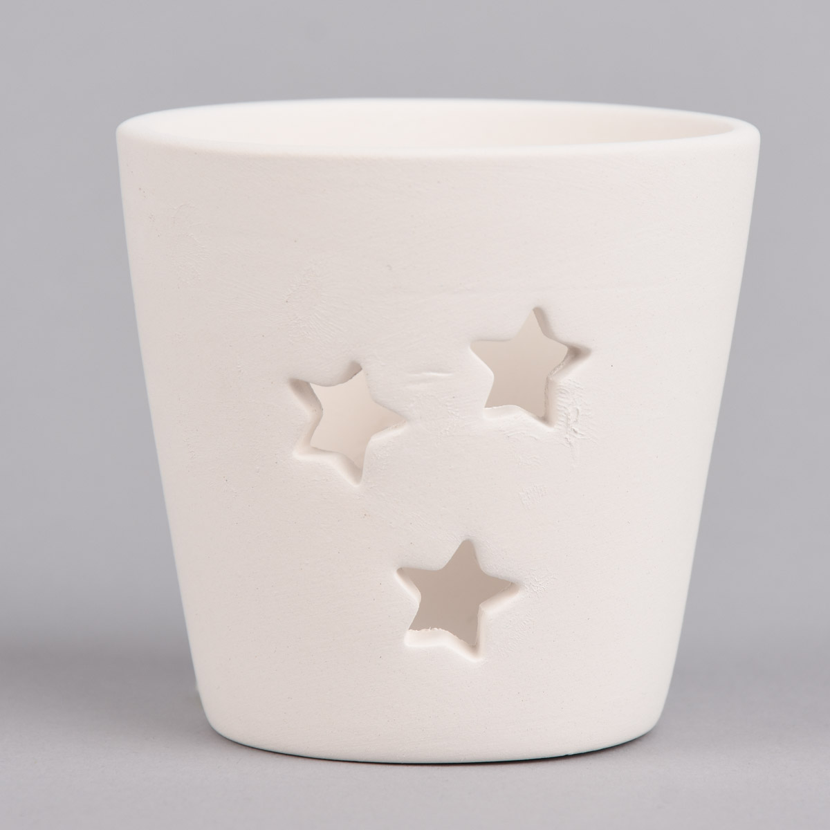 Aus diesem weißen Teelichthalter mit ausgestanzten Sternen lässt sich mit etwas Farbe und Kleber ein einzigartiger kleiner Kerzenhalter gestalten.
