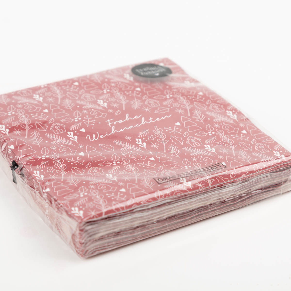 FESTLICHES DESIGN: Rote Servietten mit weißem Schriftzug „Frohe Weihnachten“ und zartem Weihnachtsmuster – stilvoll und modern.