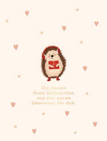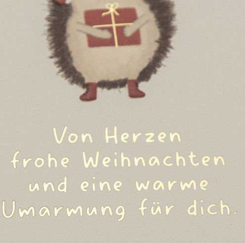 Die weihnachtliche Doppelkarte von Grafik Werkstatt verbindet ein charmantes Motiv mit edler Goldveredelung. Ein niedlicher Igel mit Geschenk in den kleinen Pfoten, darüber steht der Gruß „Von Herzen frohe Weihnachten und eine warme Umarmung für dich“ – ein warmes Motiv, das Jung und Alt begeistert. Mit dem handlichen Format 12 × 17 cm ist die Karte perfekt für persönliche Worte, Gutscheine oder als dekoratives Beigabenkärtchen zum Geschenk. Das stabile Material und die fein schimmernden Golddetails sorgen für einen hochwertigen Auftritt – ob für Familie, Freund:innen oder Kolleg:innen.
