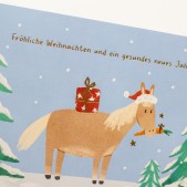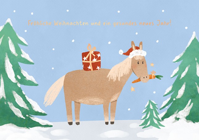 Die Postkarte mit der Aufschrift "Fröhliche Weihnachten und ein gesundes neues Jahr" und Pferdemotiv ist ideal, um lieben Menschen eine Freude zu bereiten. Die edle Gold-Veredelung verleiht der Postkarte einen besonderen Glanz.