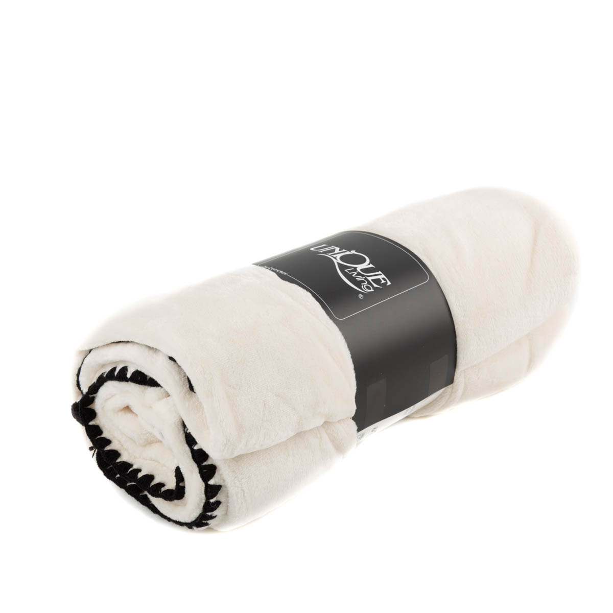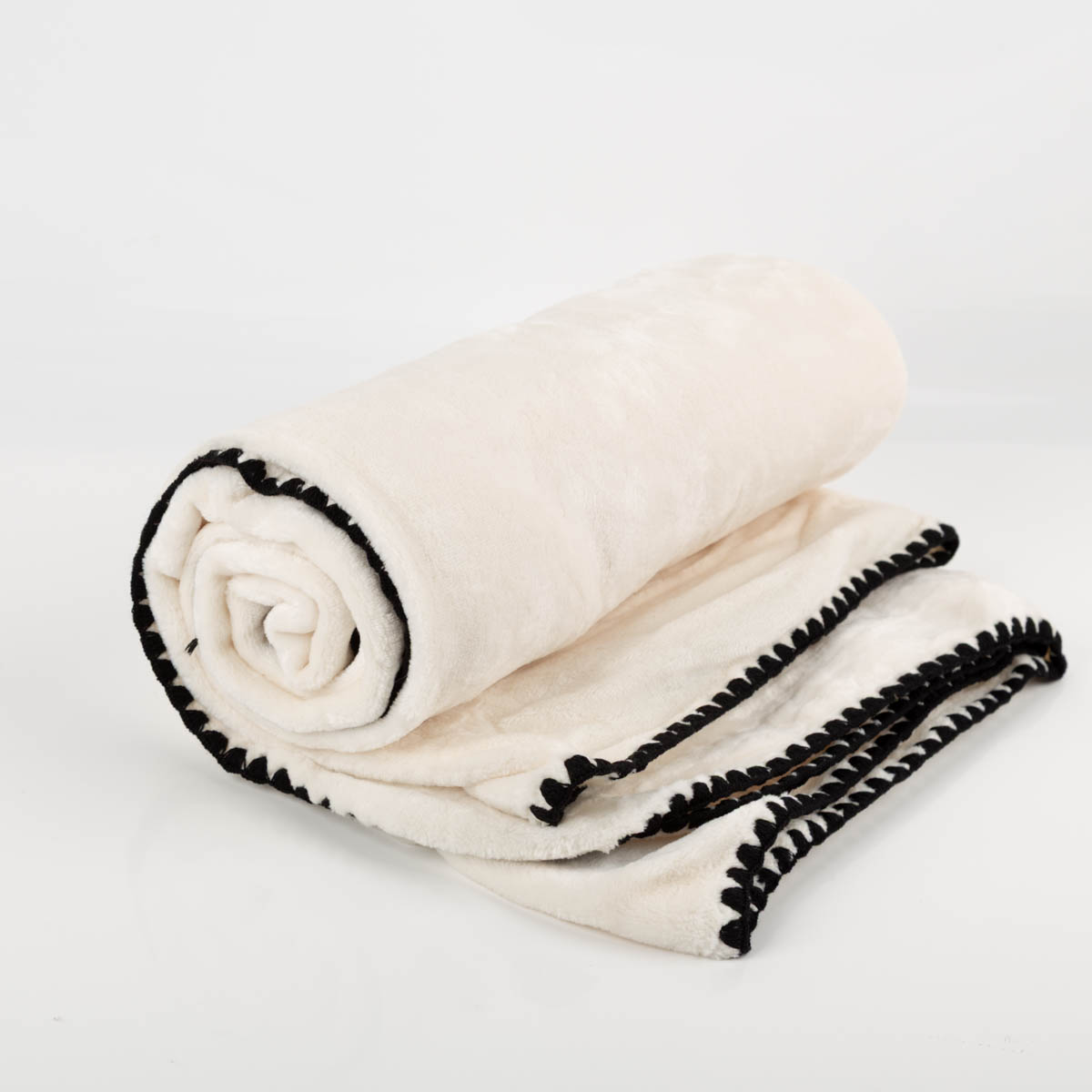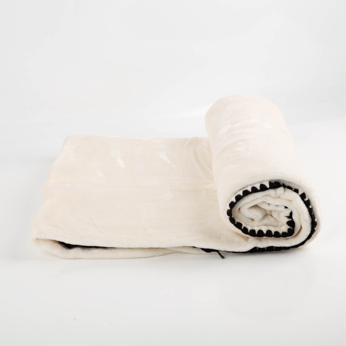 Superflauschige Kuscheldecke in Dove White mit schwarzem Kettelrand