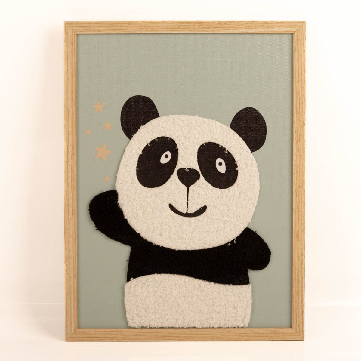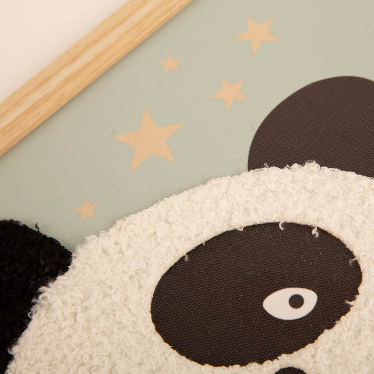 Das Besondere ist die applizierte Pandafigur: Sie besteht aus weichem Stoff mit feiner Schlingenstruktur in Schwarz und Weiß. Dadurch wirkt der Panda lebendig und bekommt eine charmante 3D-Optik, die Kinder sofort begeistert. Der naturbelassene Holzrahmen rundet das Bild stilvoll ab und bringt einen warmen, natürlichen Look an die Wand.