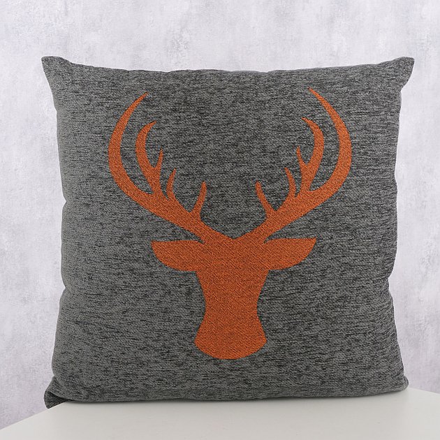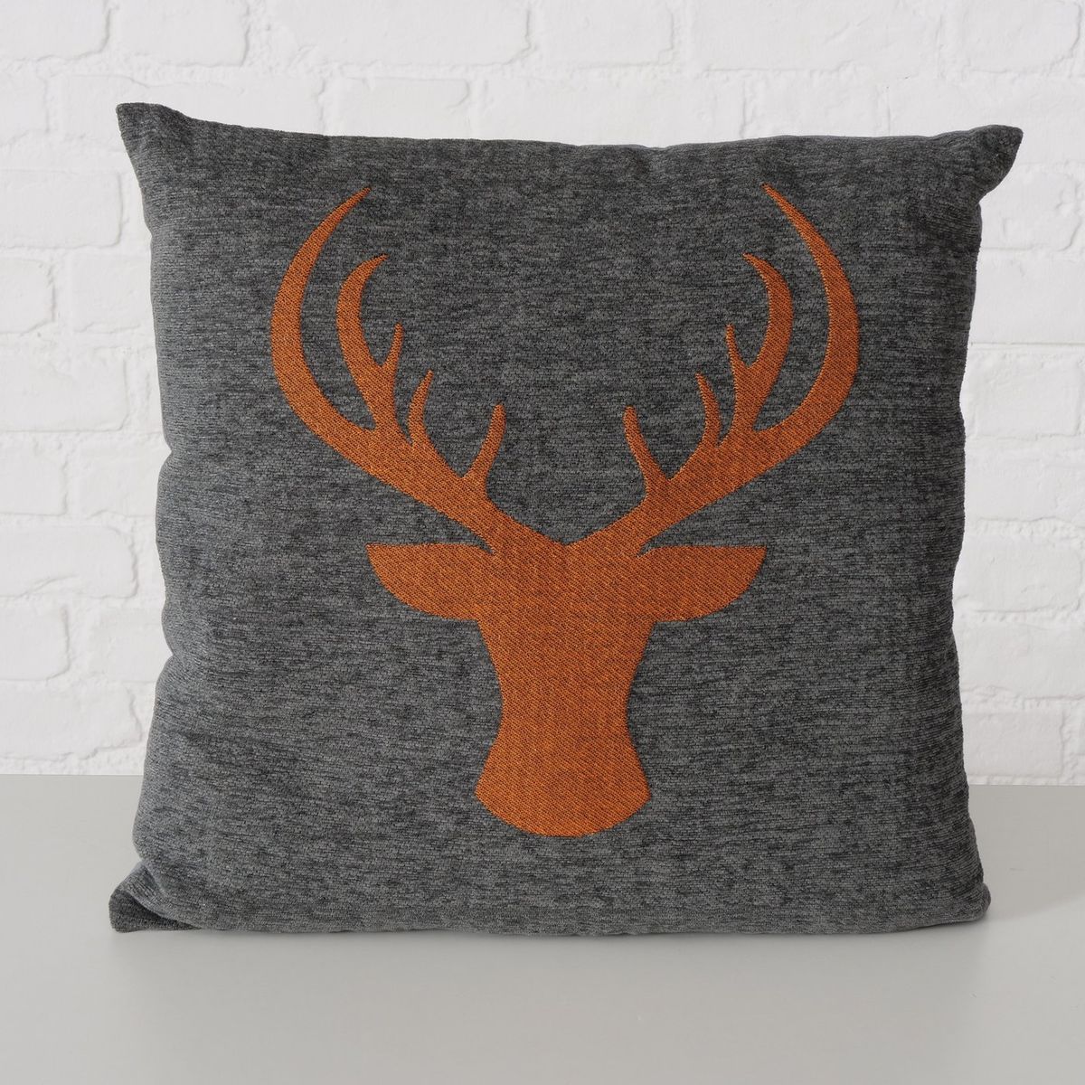 Dekokissen von Boltze mit großem eingewebtem Hirschkopf in Orange auf grauem Chenillehintergrund für wohnliche Akzente auf Sofa, Sessel oder Bett