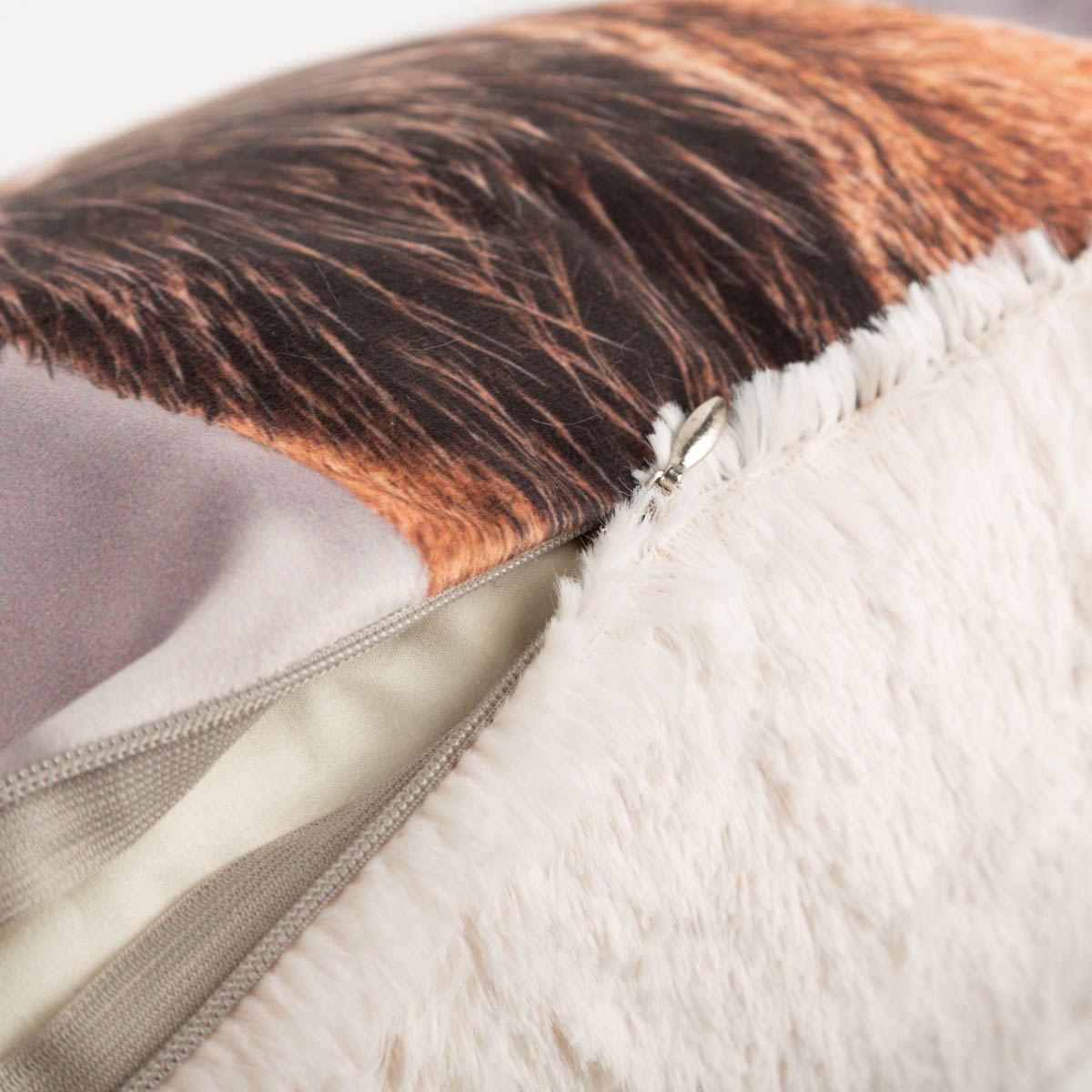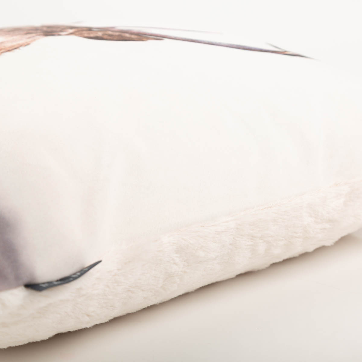 Einzigartige Kissenhülle mit Hirschkopf und kuschelweicher Plüschrückseite in Weiß.
