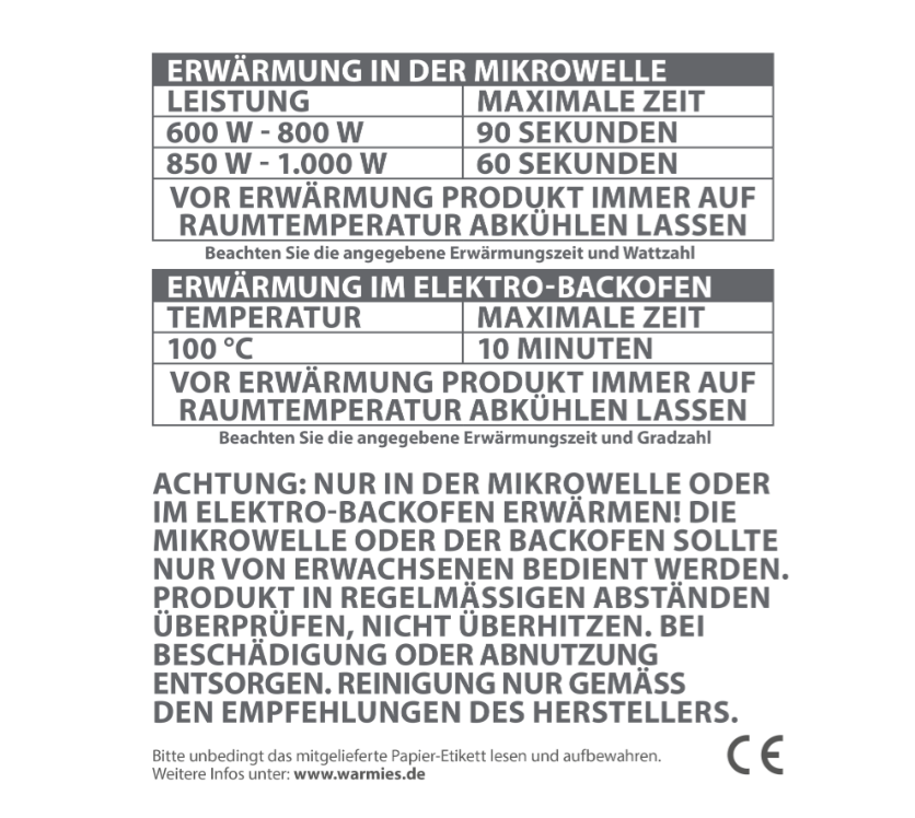 Vor jeder Erwärmung das Produkt vollständig auf Raumtemperatur abkühlen lassen. Nach dem Erwärmen sorgfältig durchkneten und die Temperatur an einer empfindlichen Körperstelle prüfen.