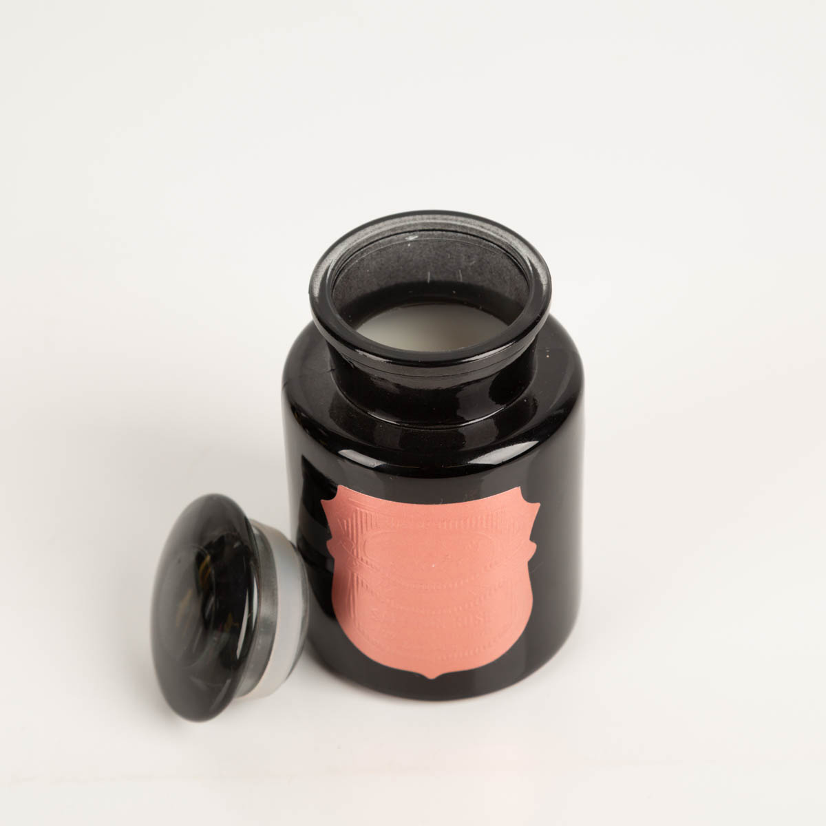 Schwarzes Glas im klassischen Apothekerstil mit geprägtem Metallic-Etikett