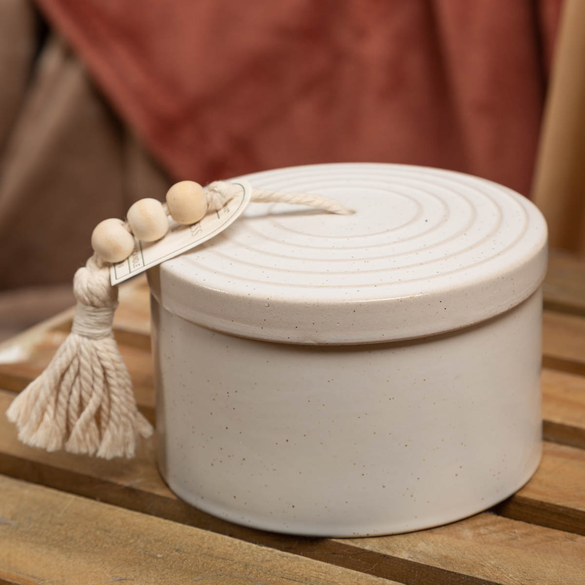 Die weiße, gesprenkelte Keramikdose mit Holzperlen und Quaste ist ein echter Hingucker und nach dem Abbrennen vielseitig weiterverwendbar. Ideal als Geschenk oder stilvolles Wohnaccessoire.