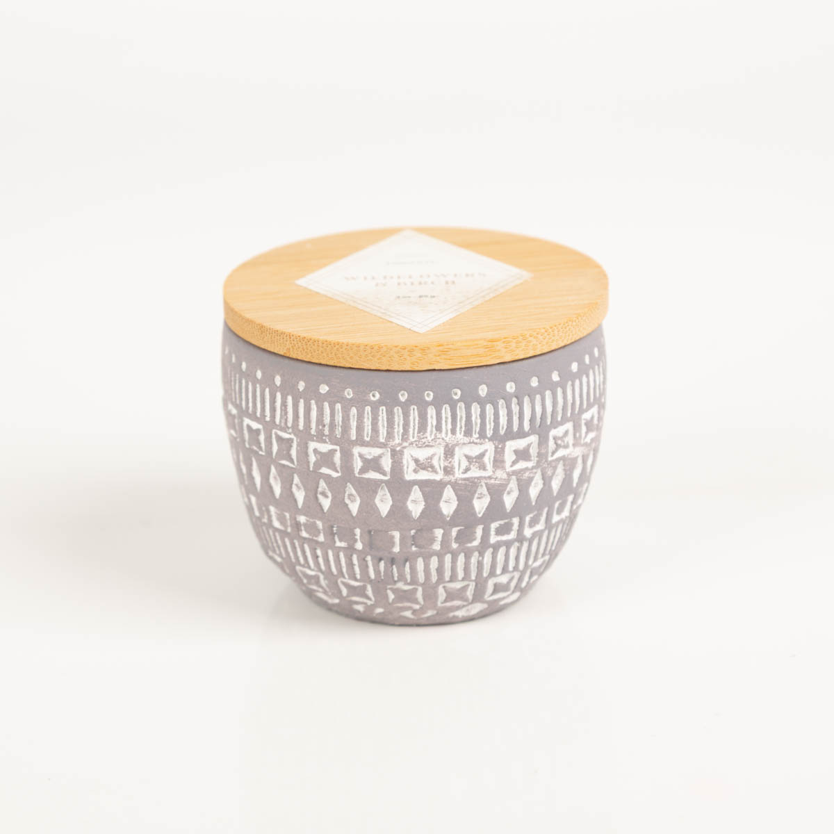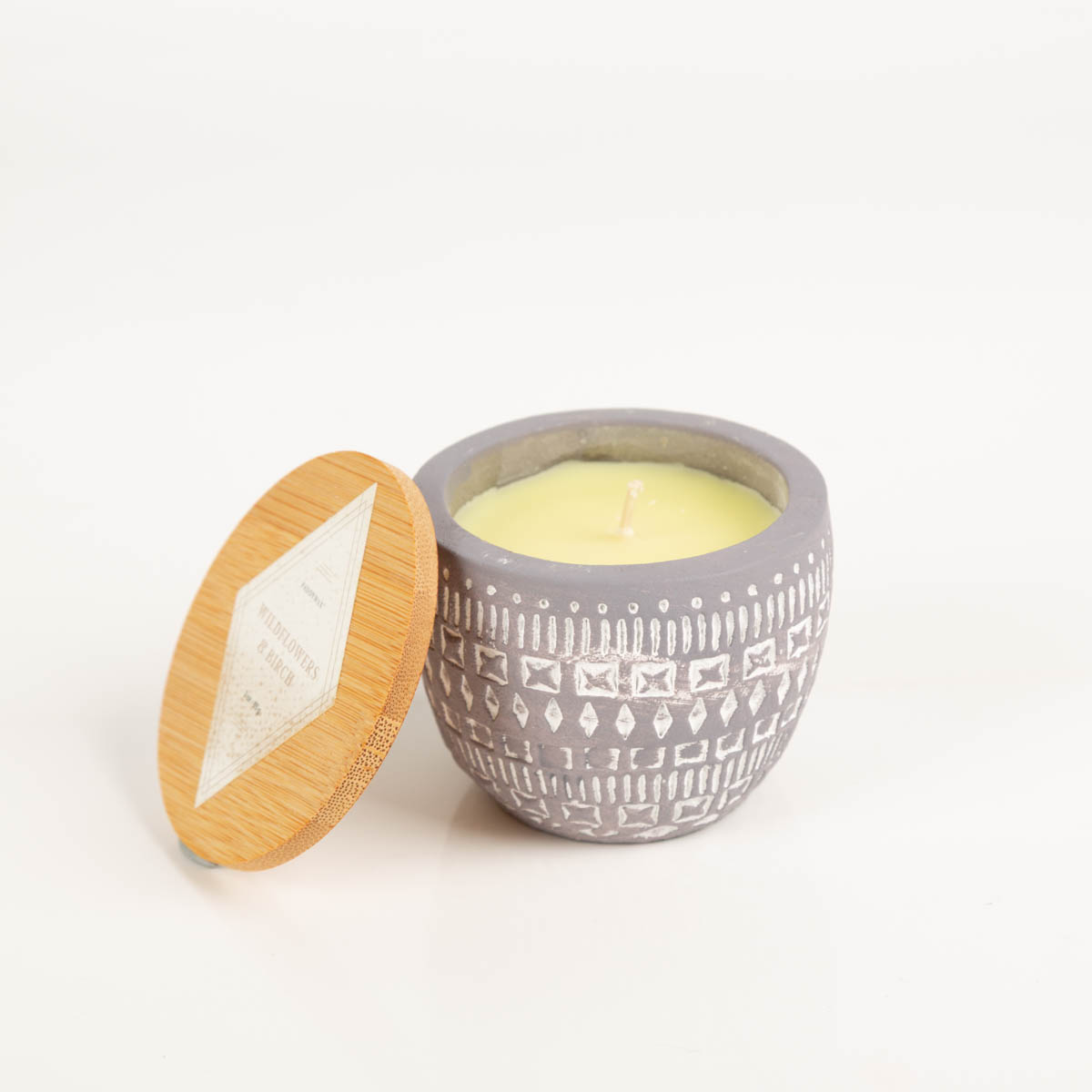 Sojaduftkerze im handveredelten Betongefäß mit Holzdeckel
